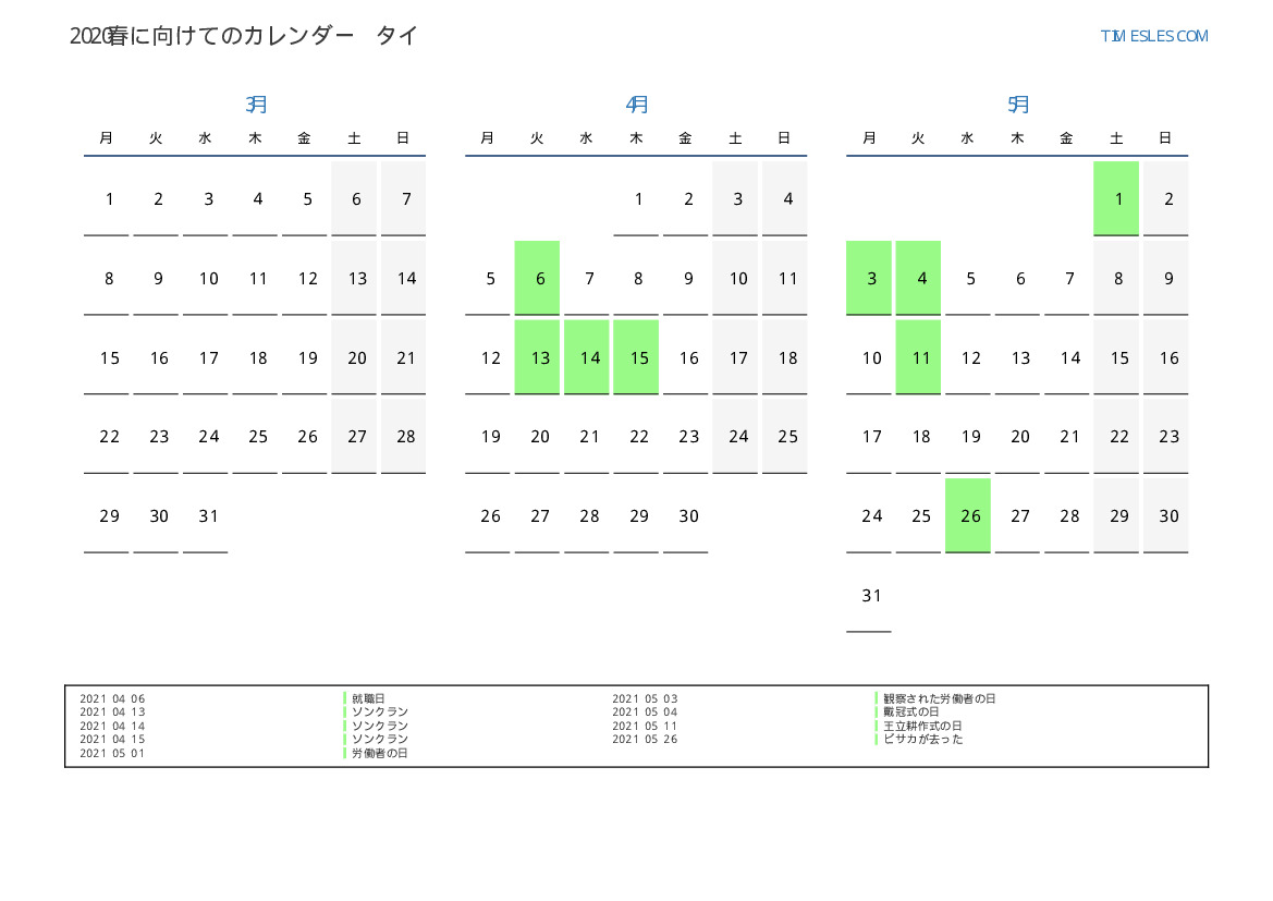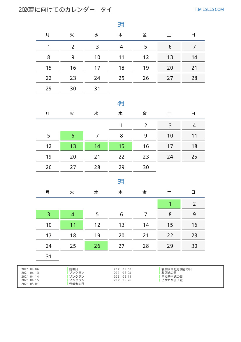 タイ向け2021春に向けての休日と週末のPDFカレンダーをダウンロードして印刷します