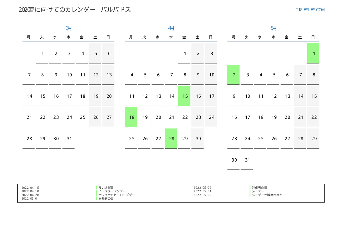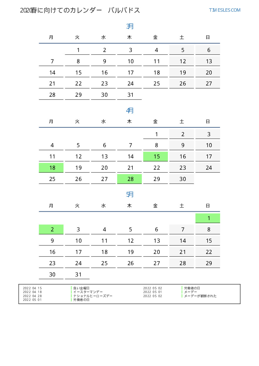 バルバドスのために2022春に向けての休日と週末のPDFカレンダーをダウンロードして印刷します