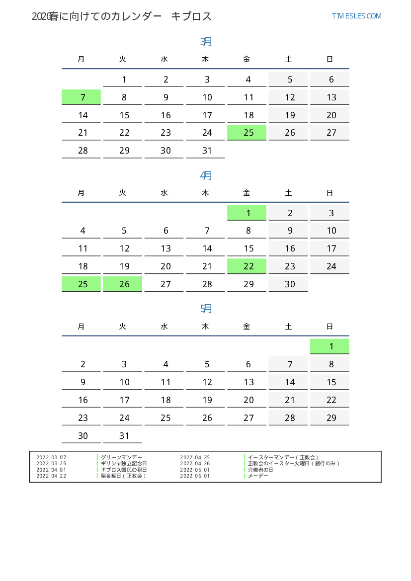 キプロス向け2022春に向けての休日と週末のカレンダー