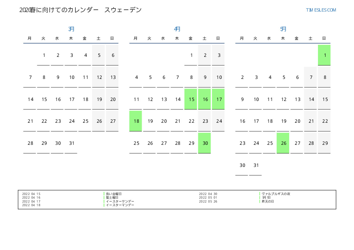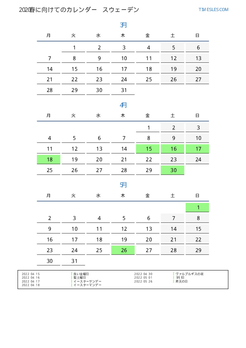 スウェーデン向け2022春に向けての休日と週末のカレンダー