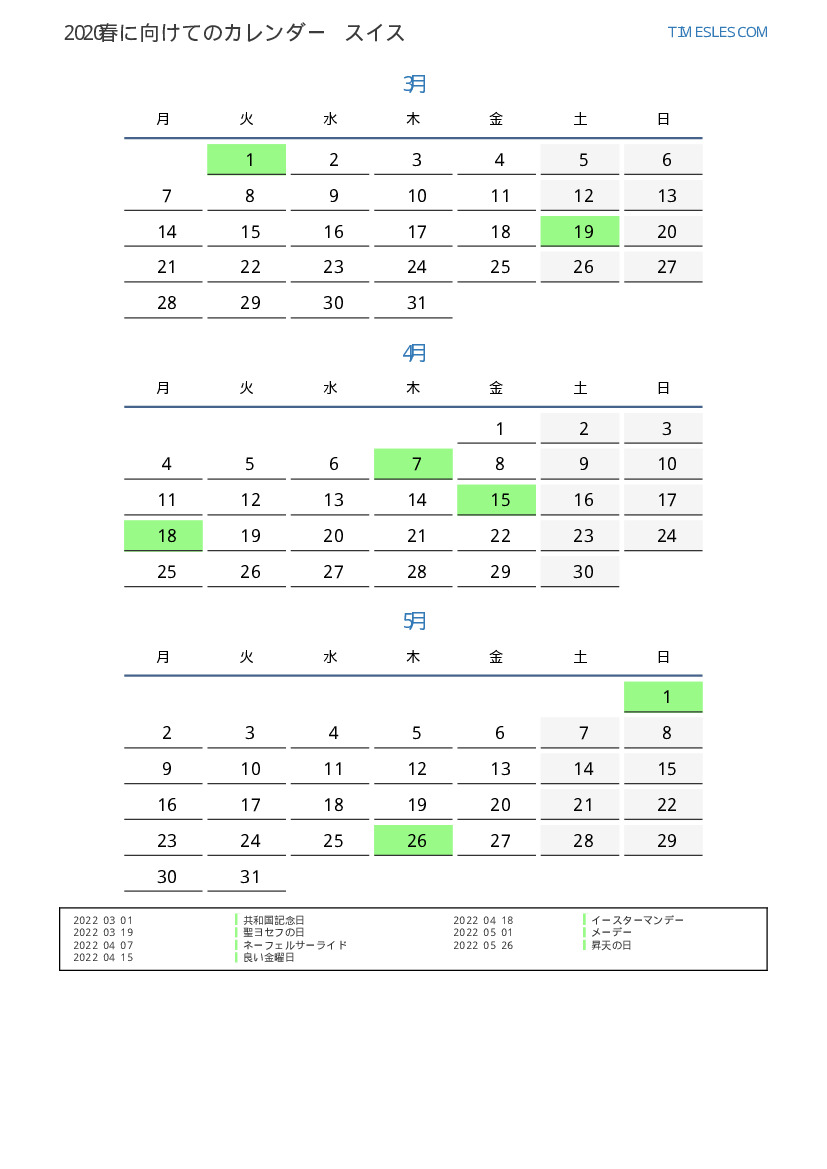 スイス向け2022春に向けての休日と週末のPDFカレンダーをダウンロードして印刷します