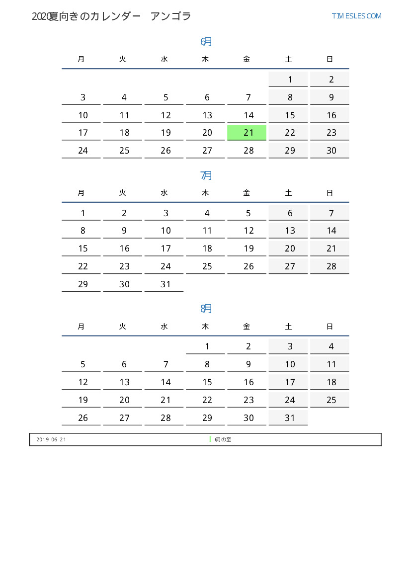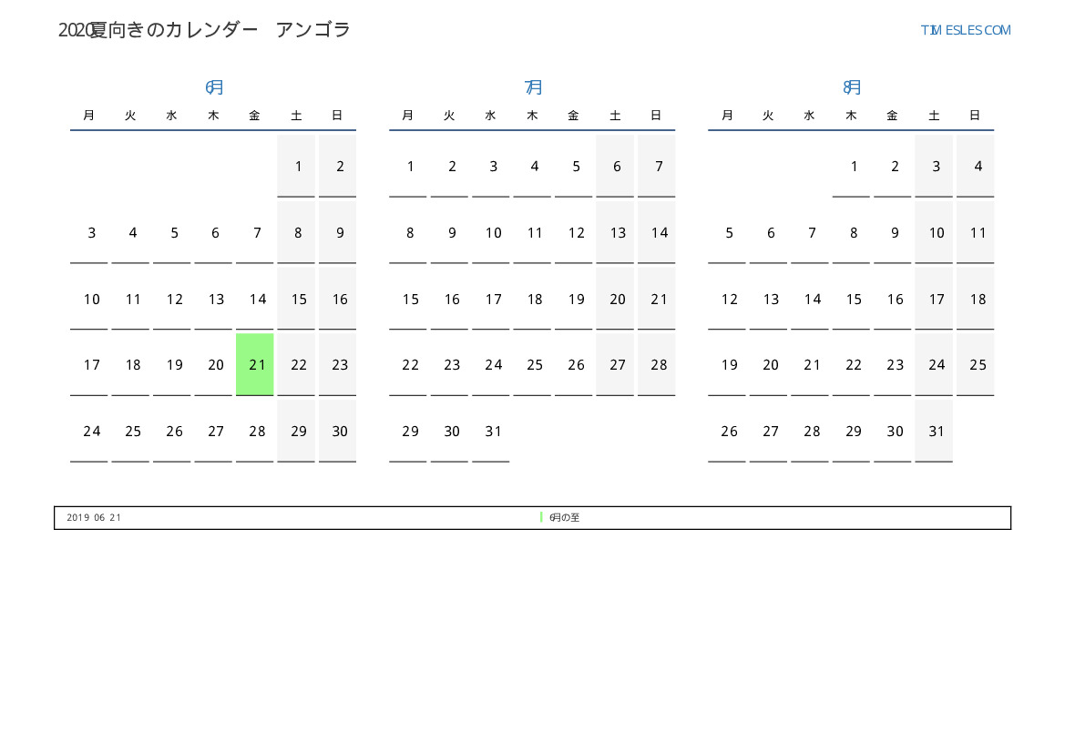 アンゴラ向け2019夏向きの休日と週末のカレンダー