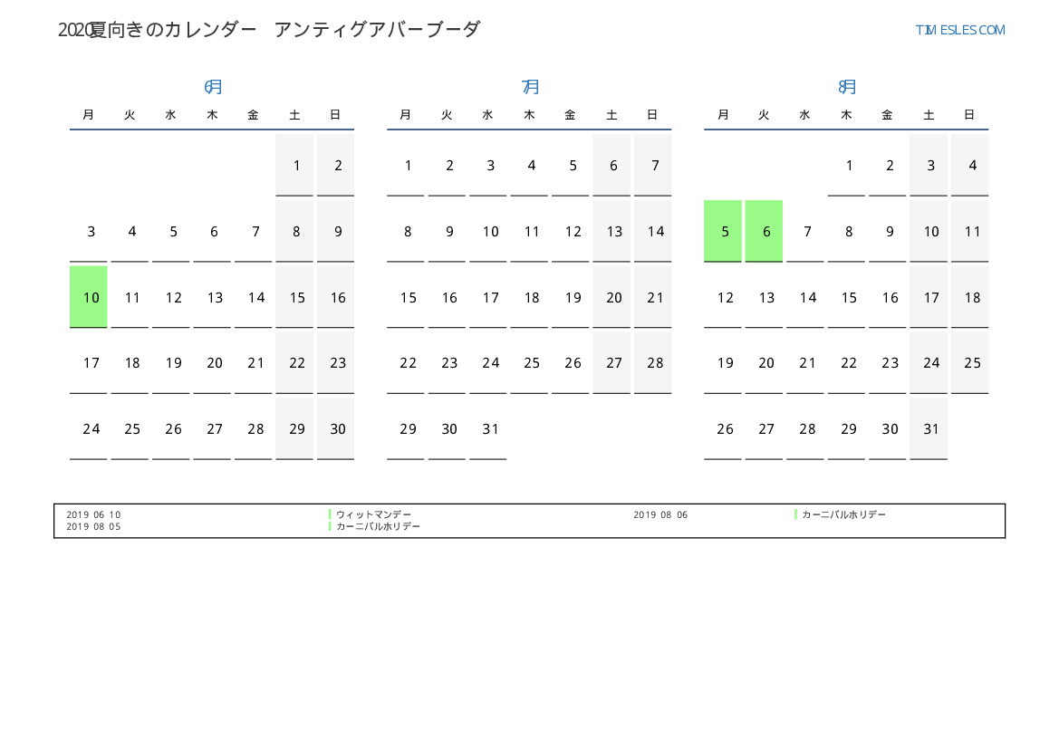 アンティグアバーブーダ2019夏向きの休日と週末のカレンダー