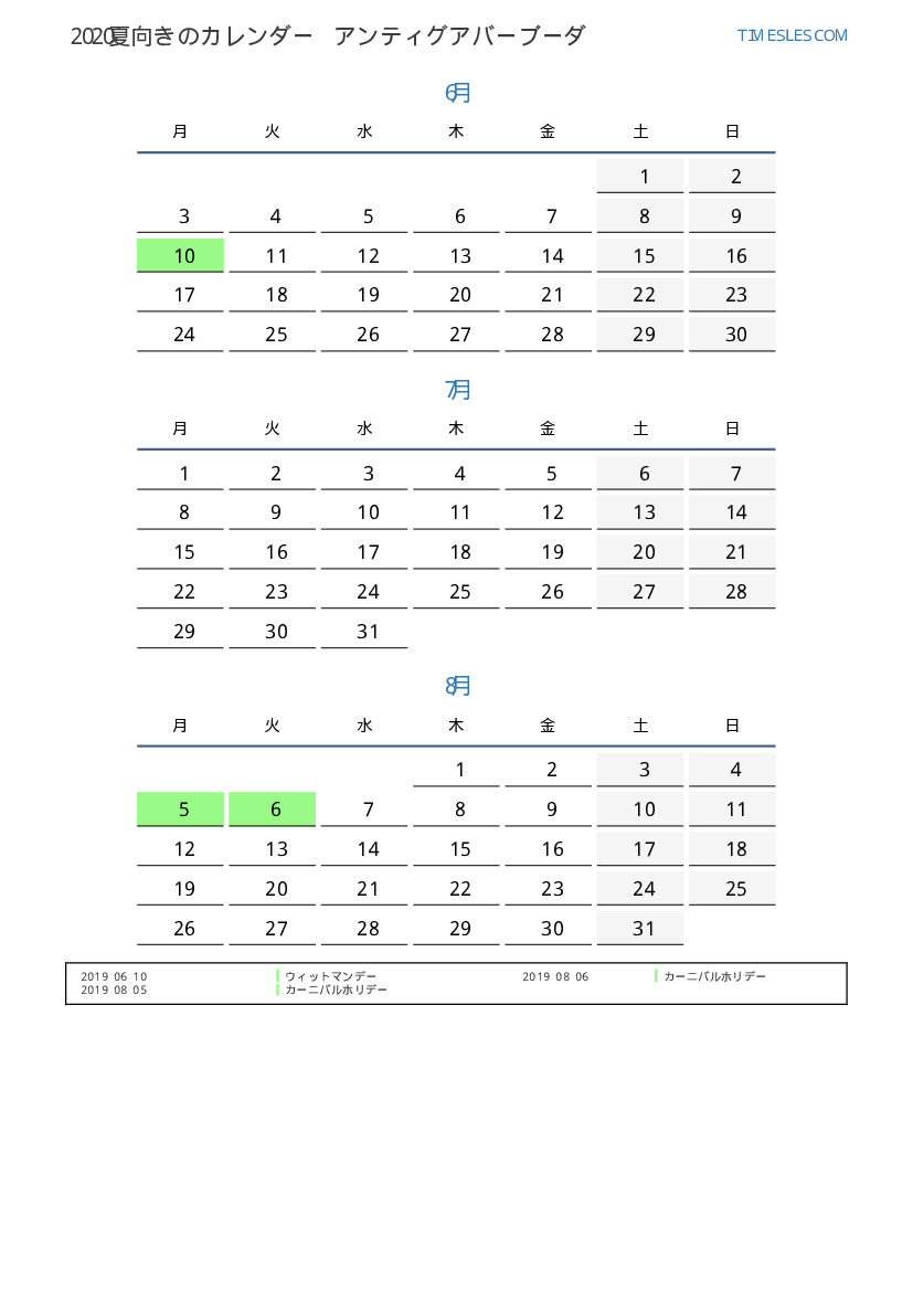 アンティグアバーブーダ2019年夏向きのカレンダー