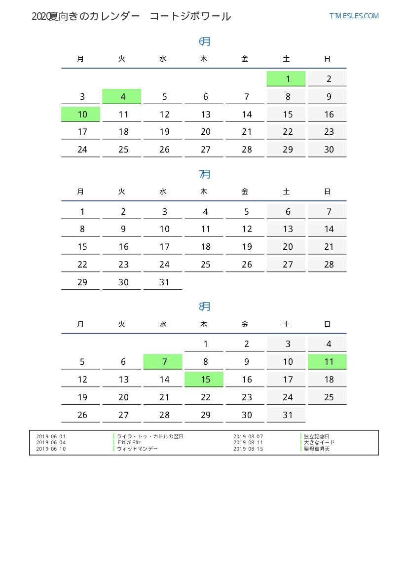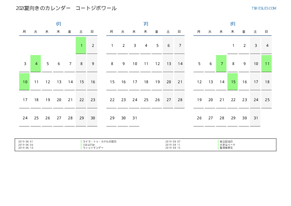 コートジボワール2019夏向きの休日と週末のカレンダー