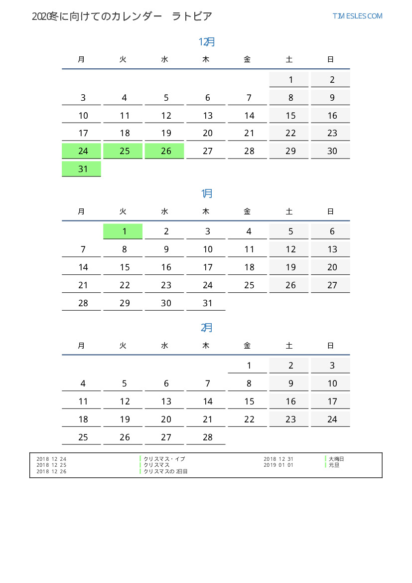 ラトビア向け2019夏向きの休日と週末のカレンダー