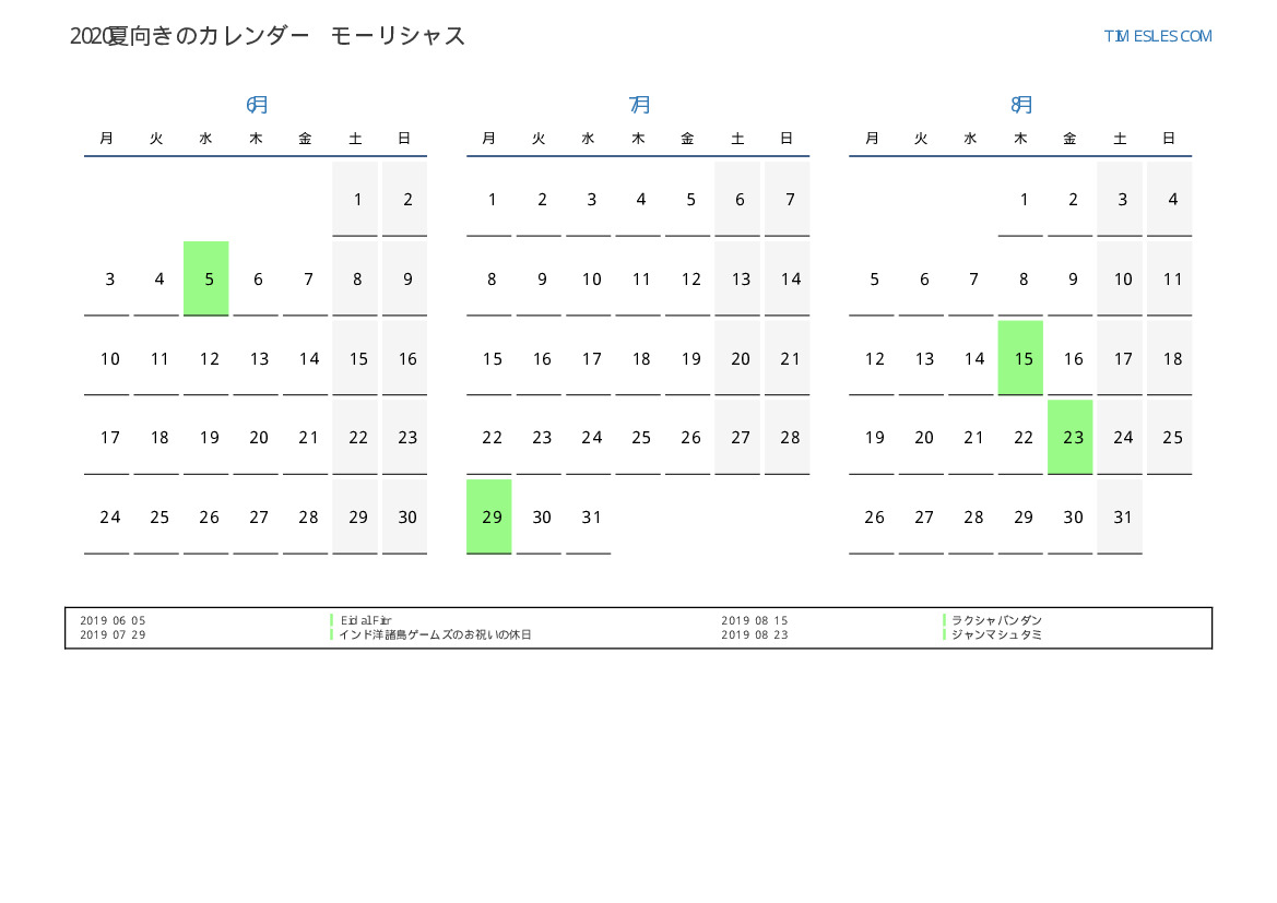 モーリシャスのために2019夏向きの休日と週末のカレンダー