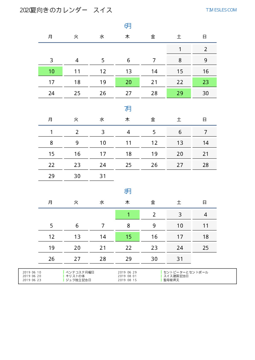 スイス向け2019夏向きの休日と週末のPDFカレンダーをダウンロードして印刷します
