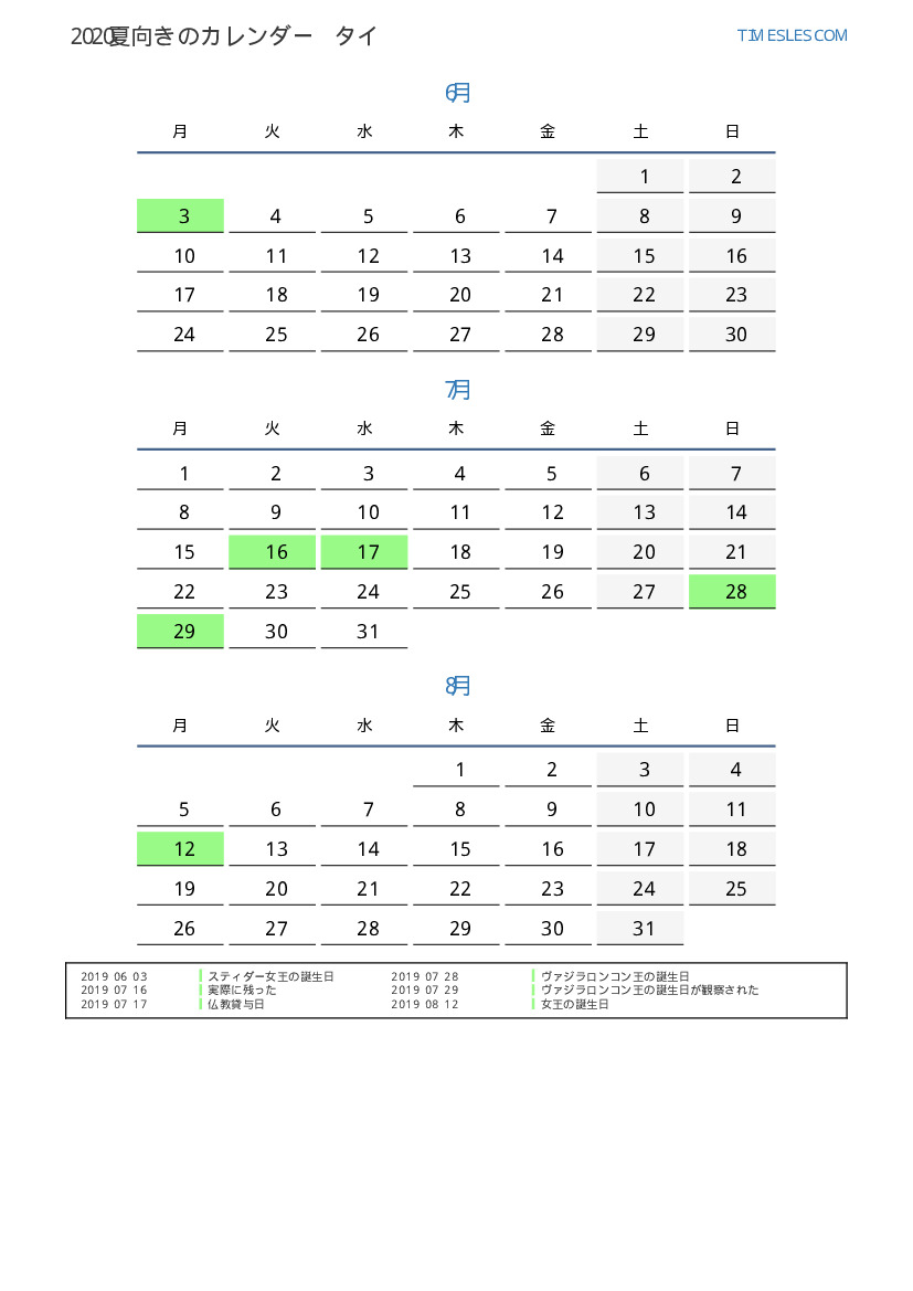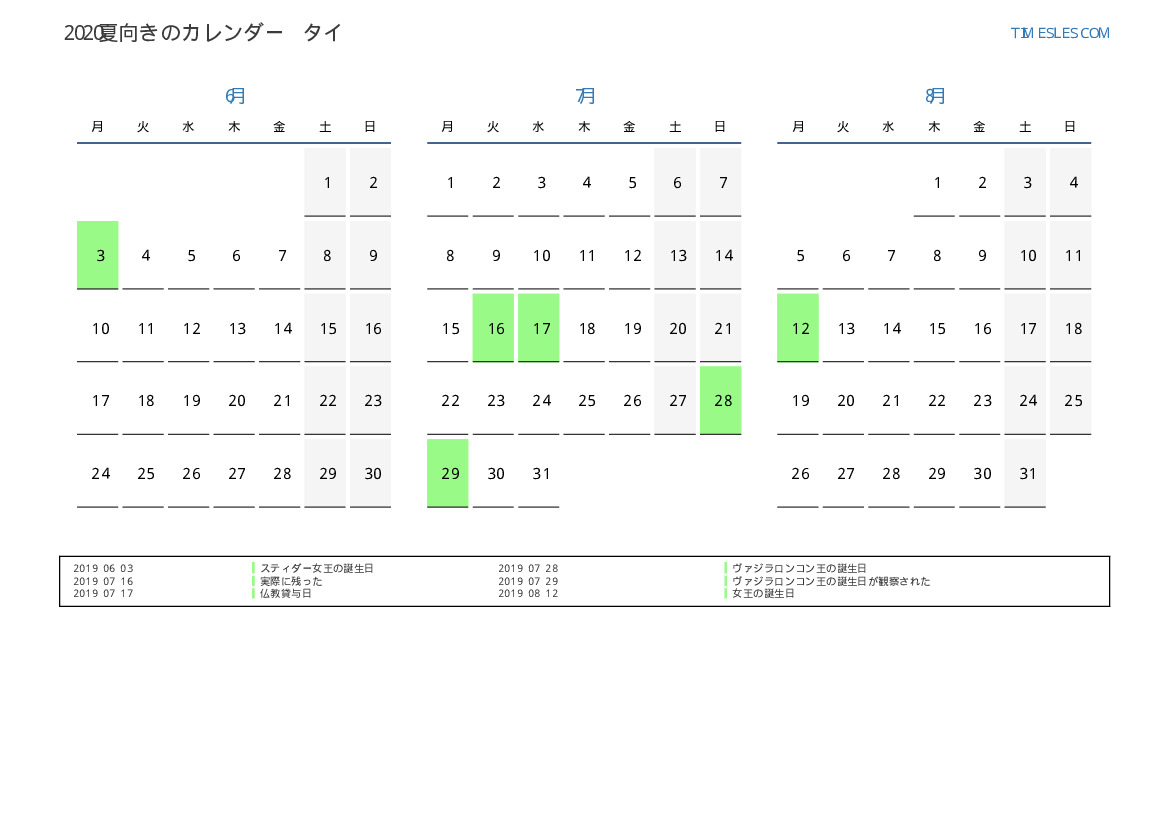タイ向け2019夏向きの休日と週末のPDFカレンダーをダウンロードして印刷します