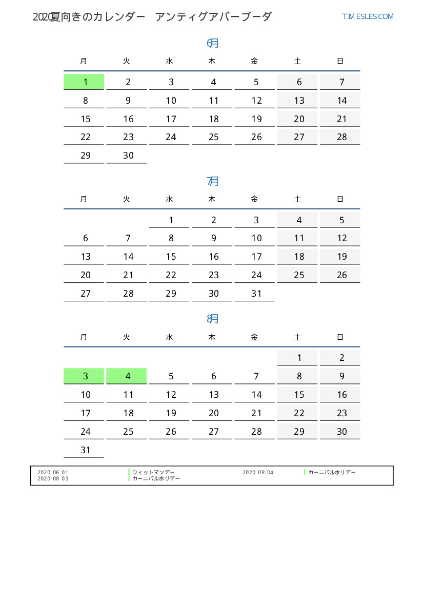 アンティグアバーブーダ2020夏向きの休日と週末のカレンダー