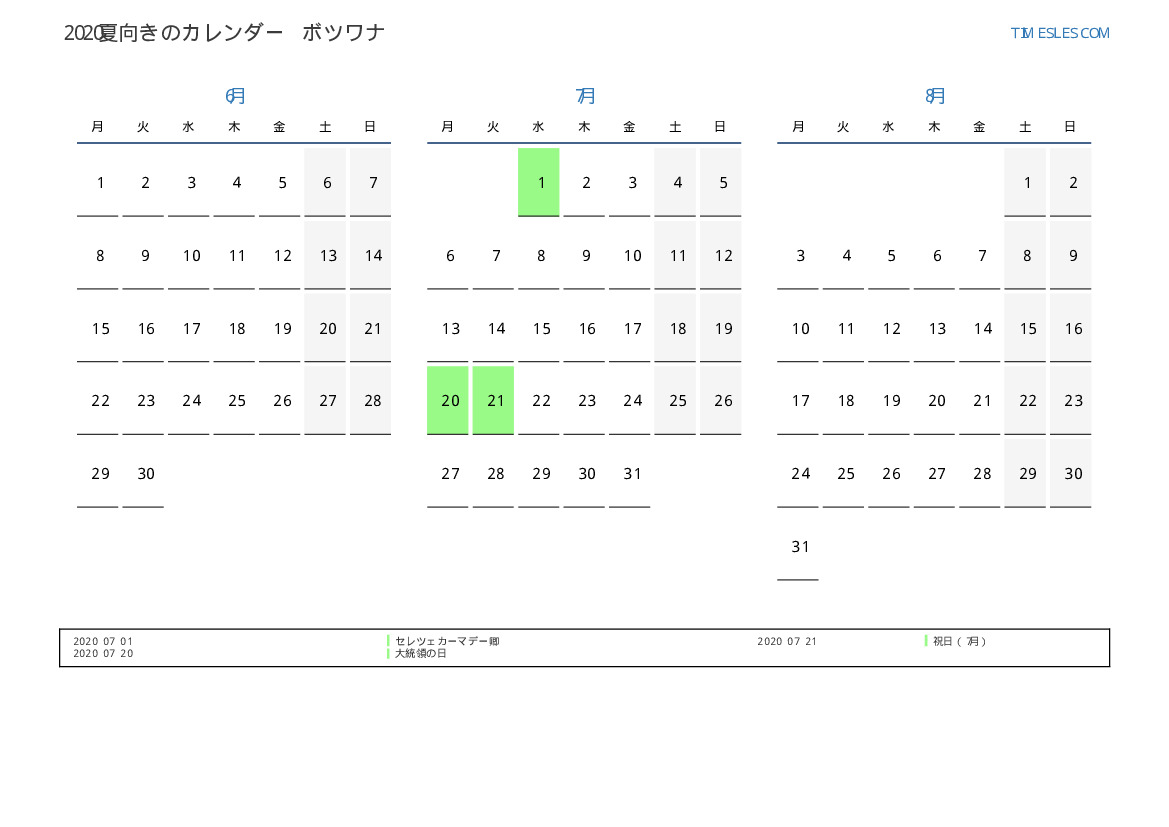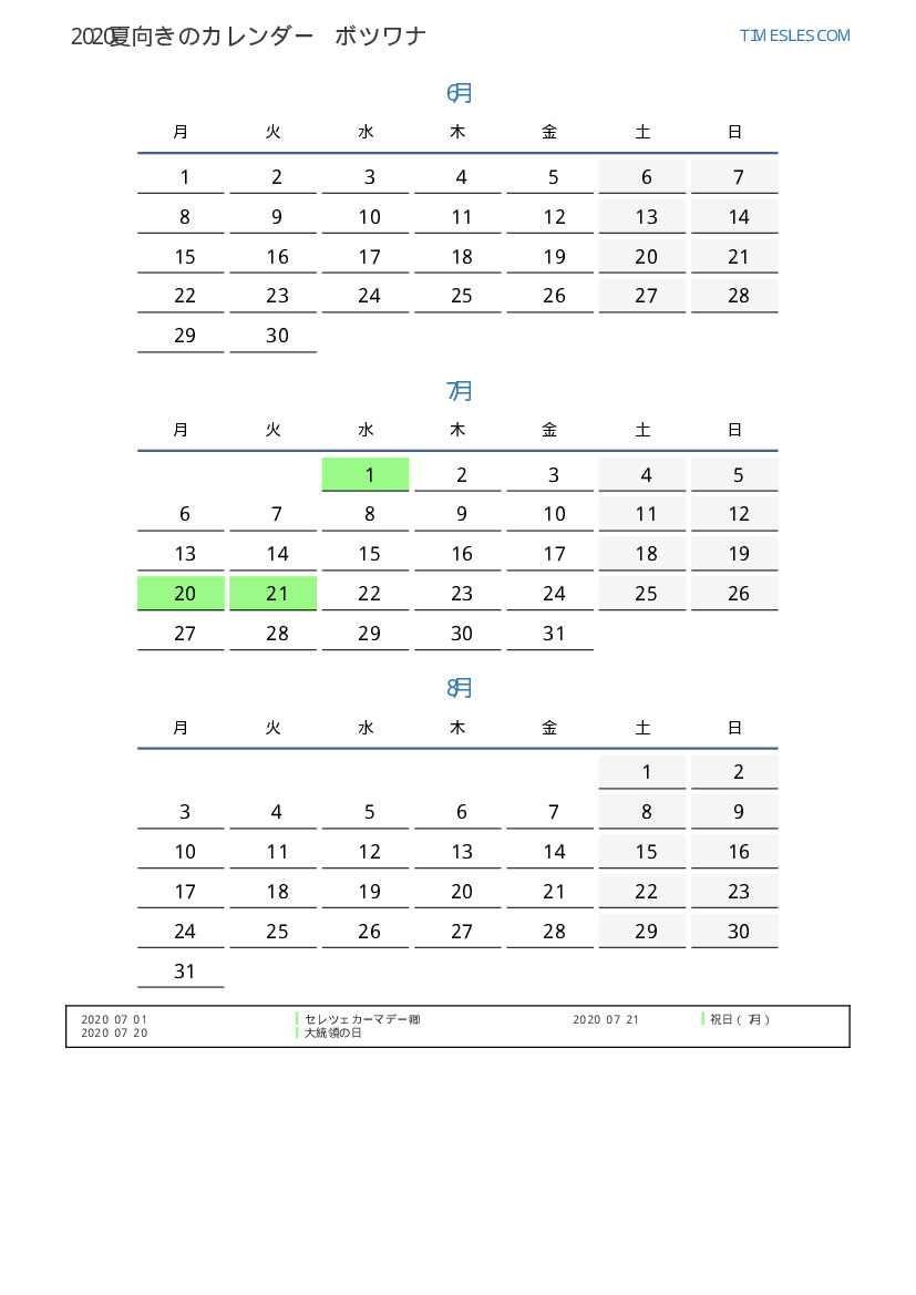 ボツワナ向け2020夏向きの休日と週末のカレンダー