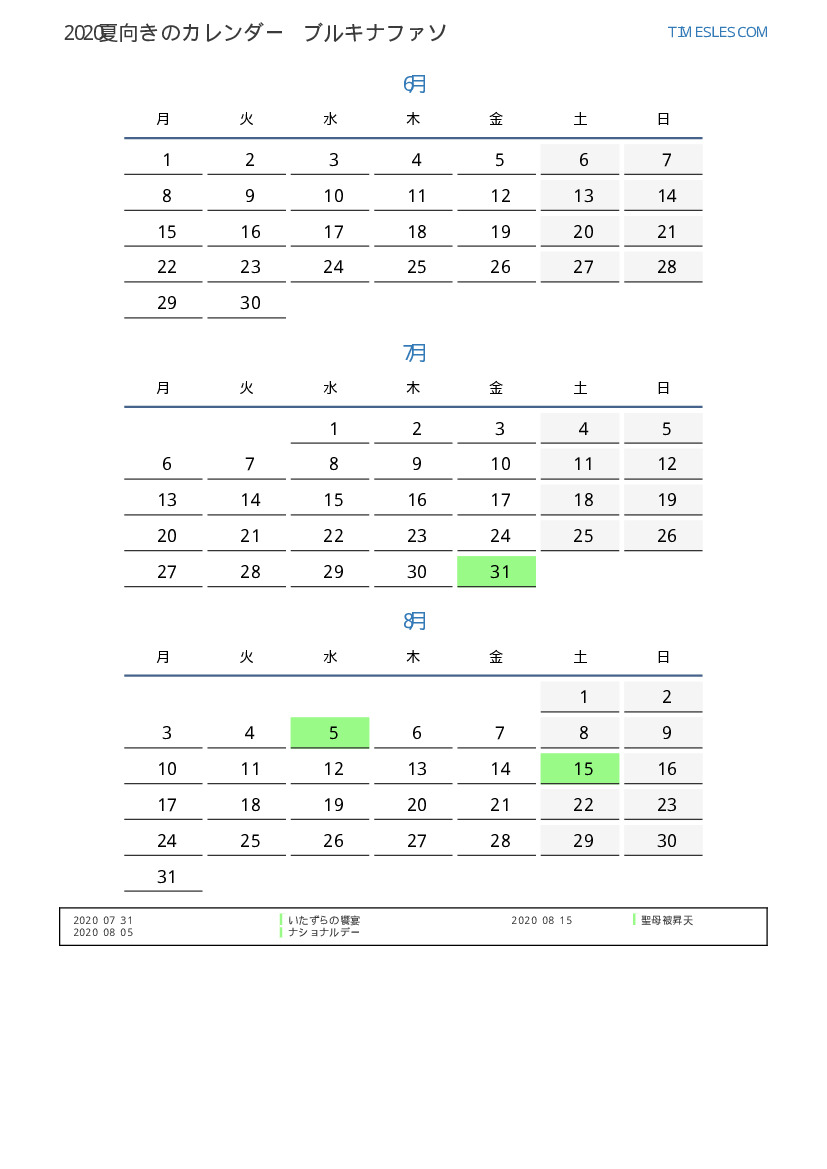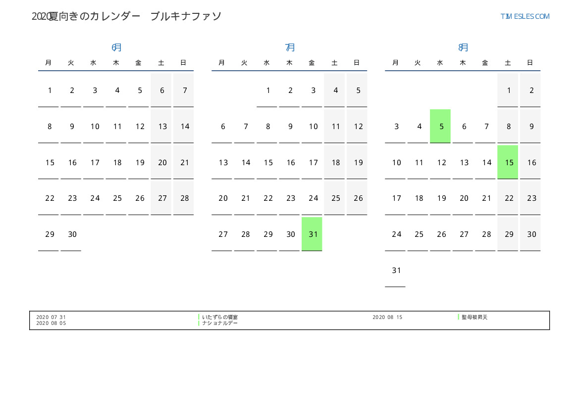 ブルキナファソ2020夏向きの休日と週末のPDFカレンダーをダウンロードして印刷します