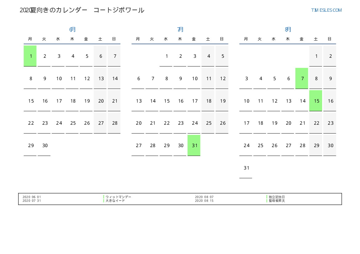 コートジボワール2020夏向きの休日と週末のPDFカレンダーをダウンロードして印刷します