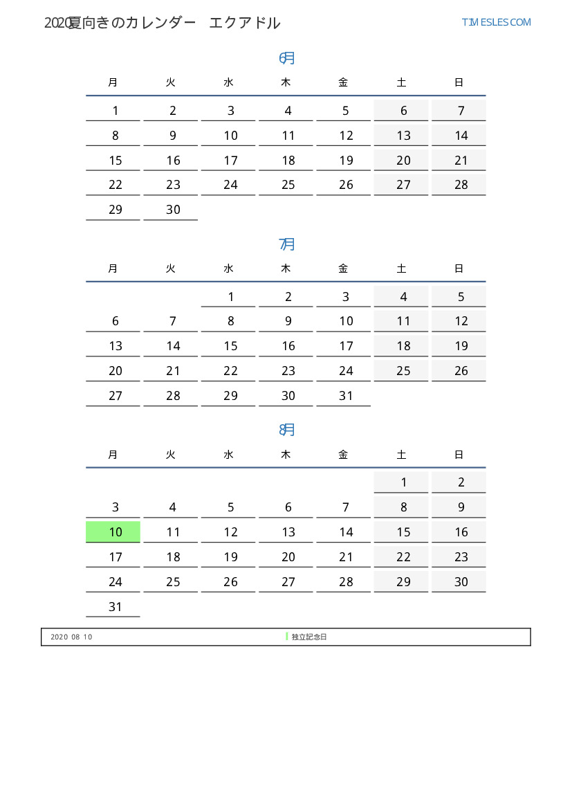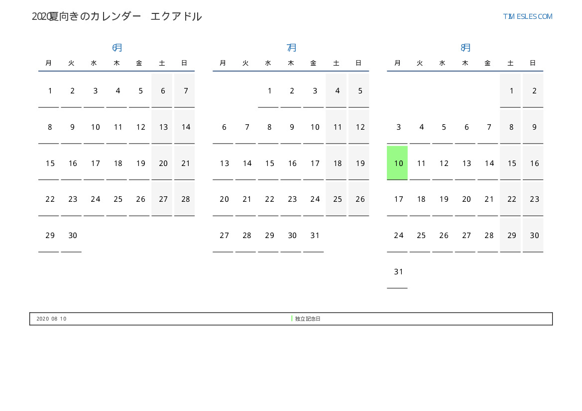 エクアドル向け2020夏向きの休日と週末のカレンダー