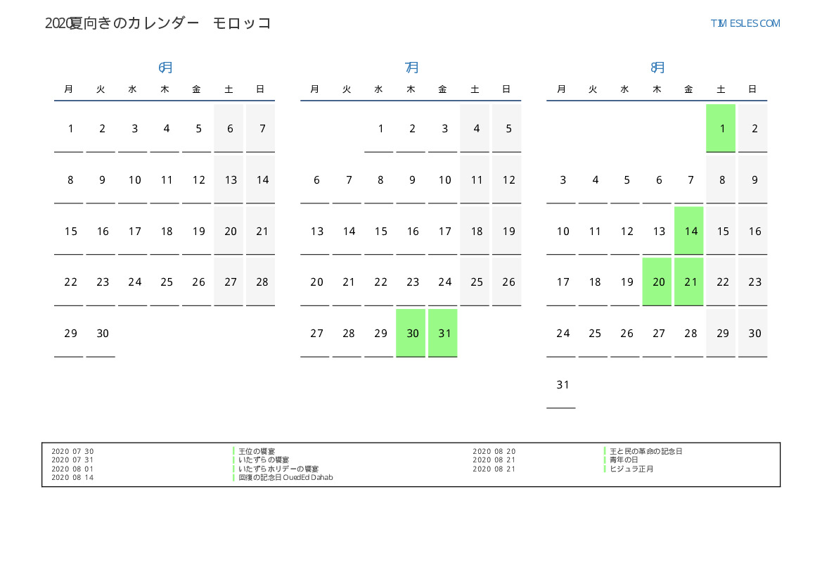 モロッコ向け2020夏向きの休日と週末のPDFカレンダーをダウンロードして印刷します