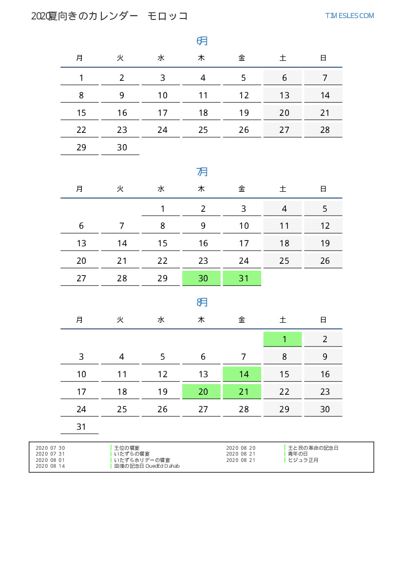 モロッコ向け2020夏向きの休日と週末のカレンダー