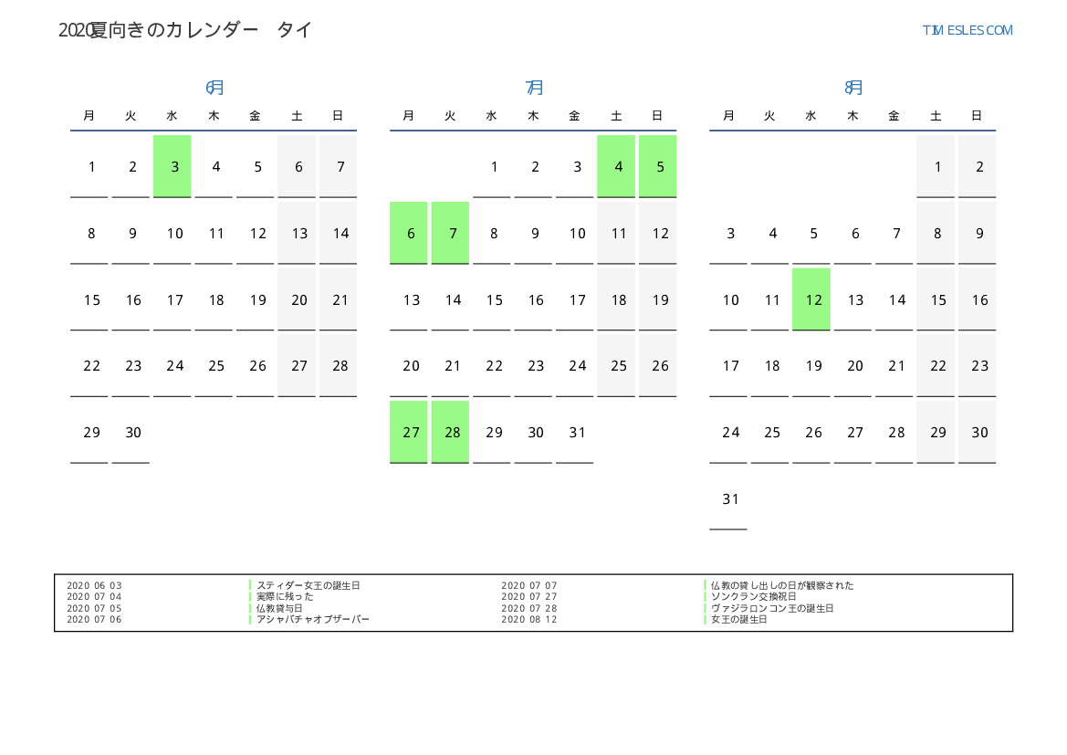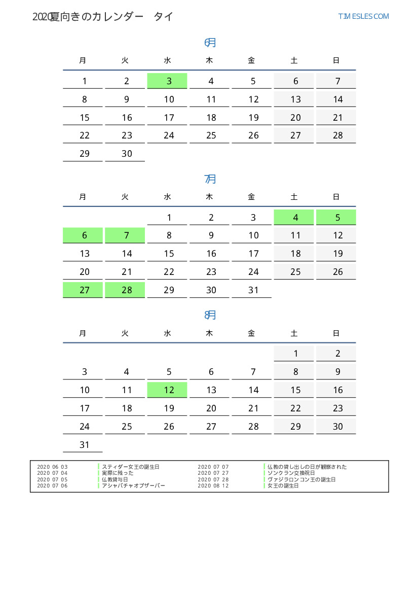 タイ向け2020夏向きの休日と週末のPDFカレンダーをダウンロードして印刷します