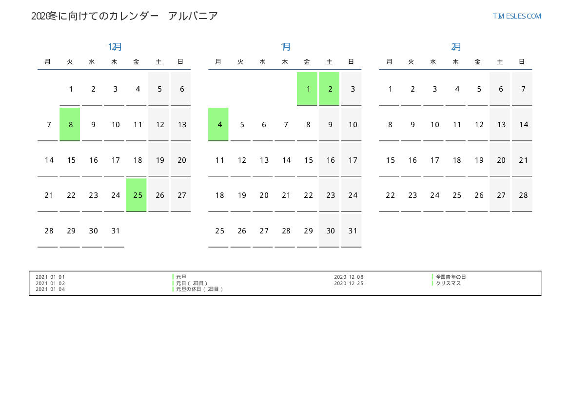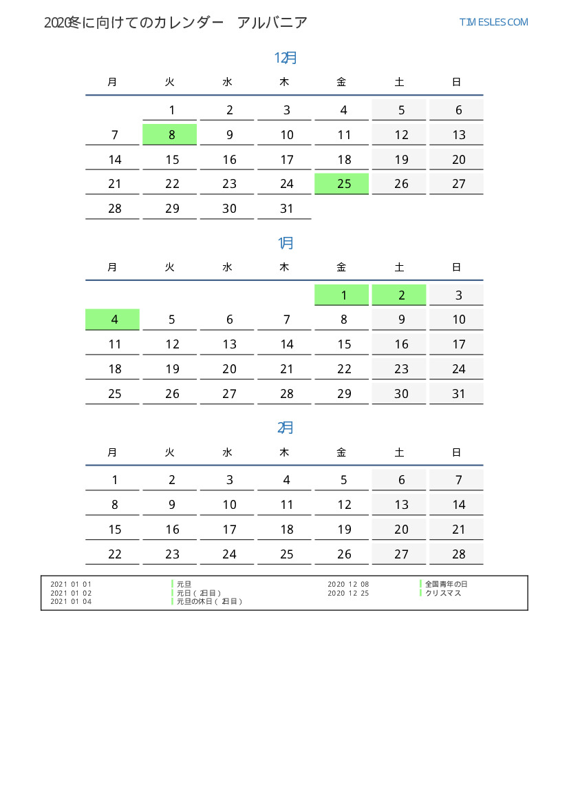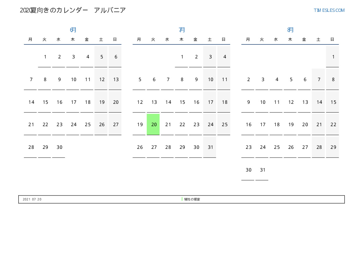 アルバニアの場合2021夏向きの休日と週末のカレンダー