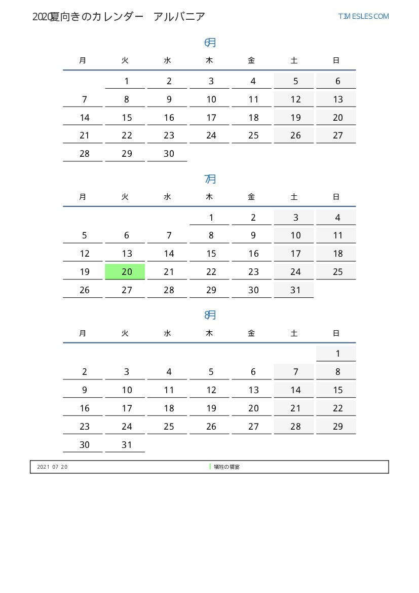 アルバニアの場合2021年夏向きのカレンダー