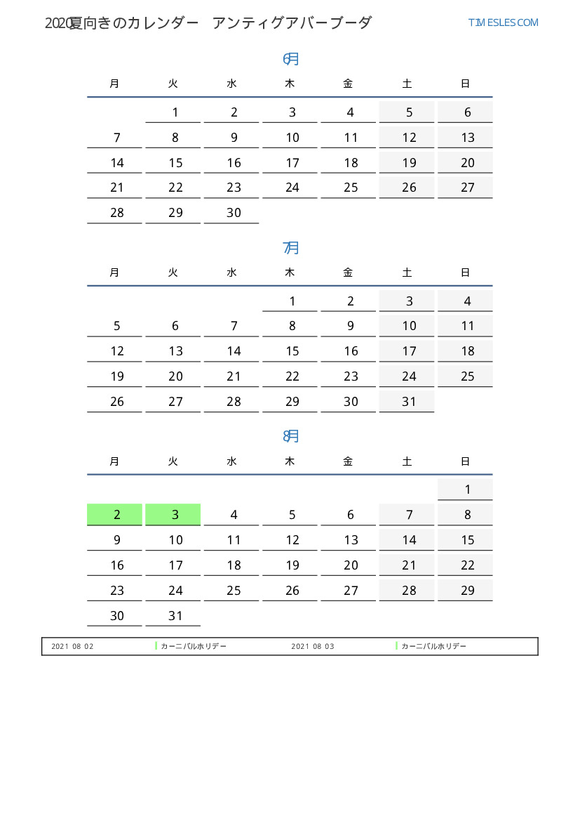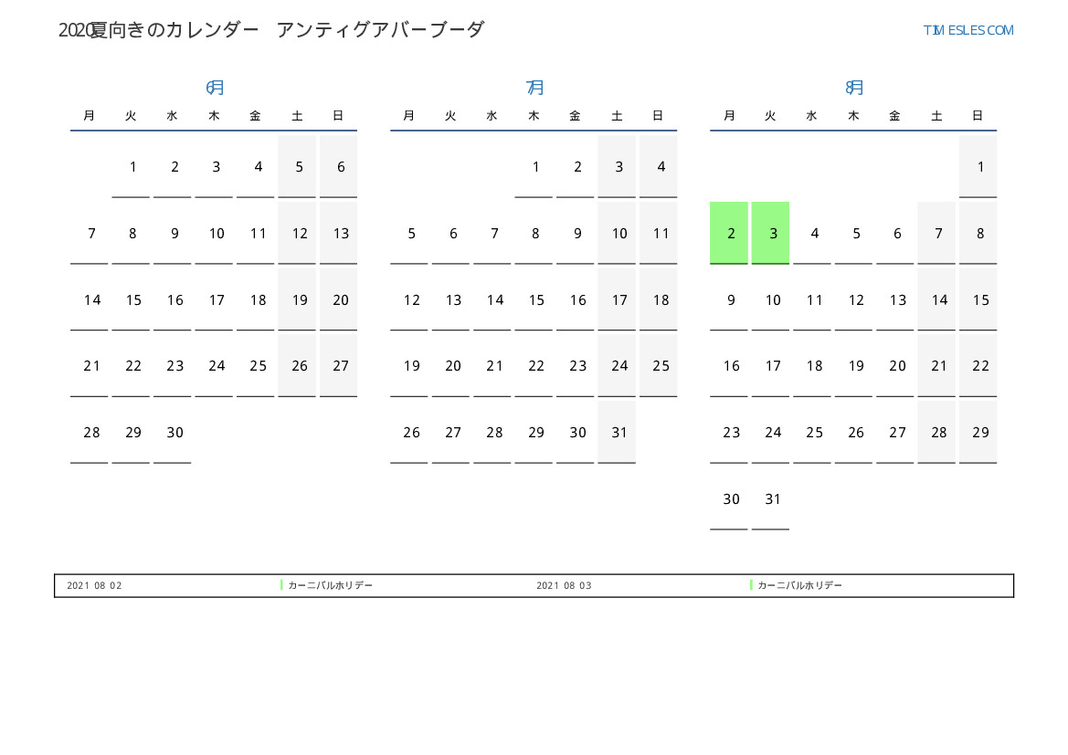 アンティグアバーブーダ2021夏向きの休日と週末のカレンダー