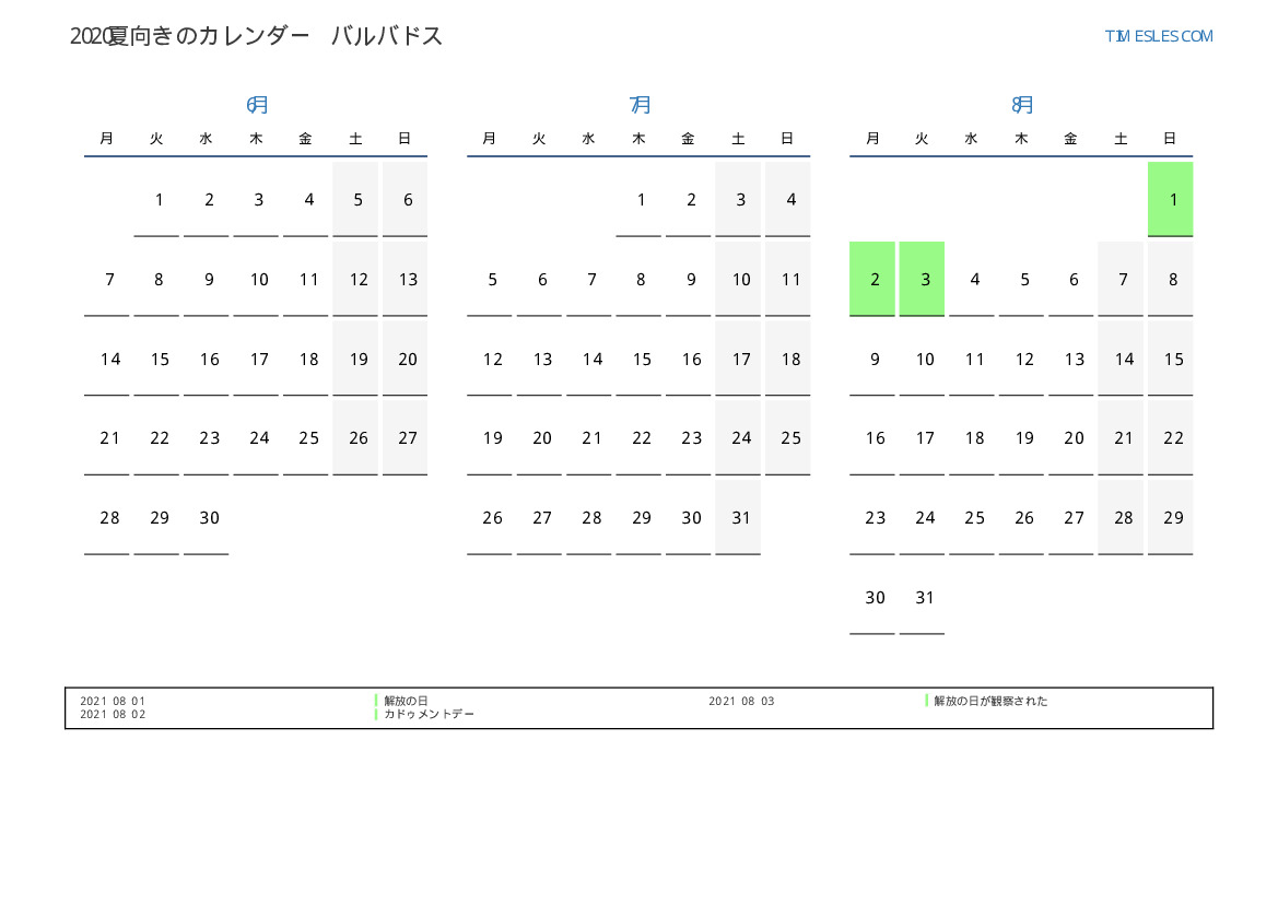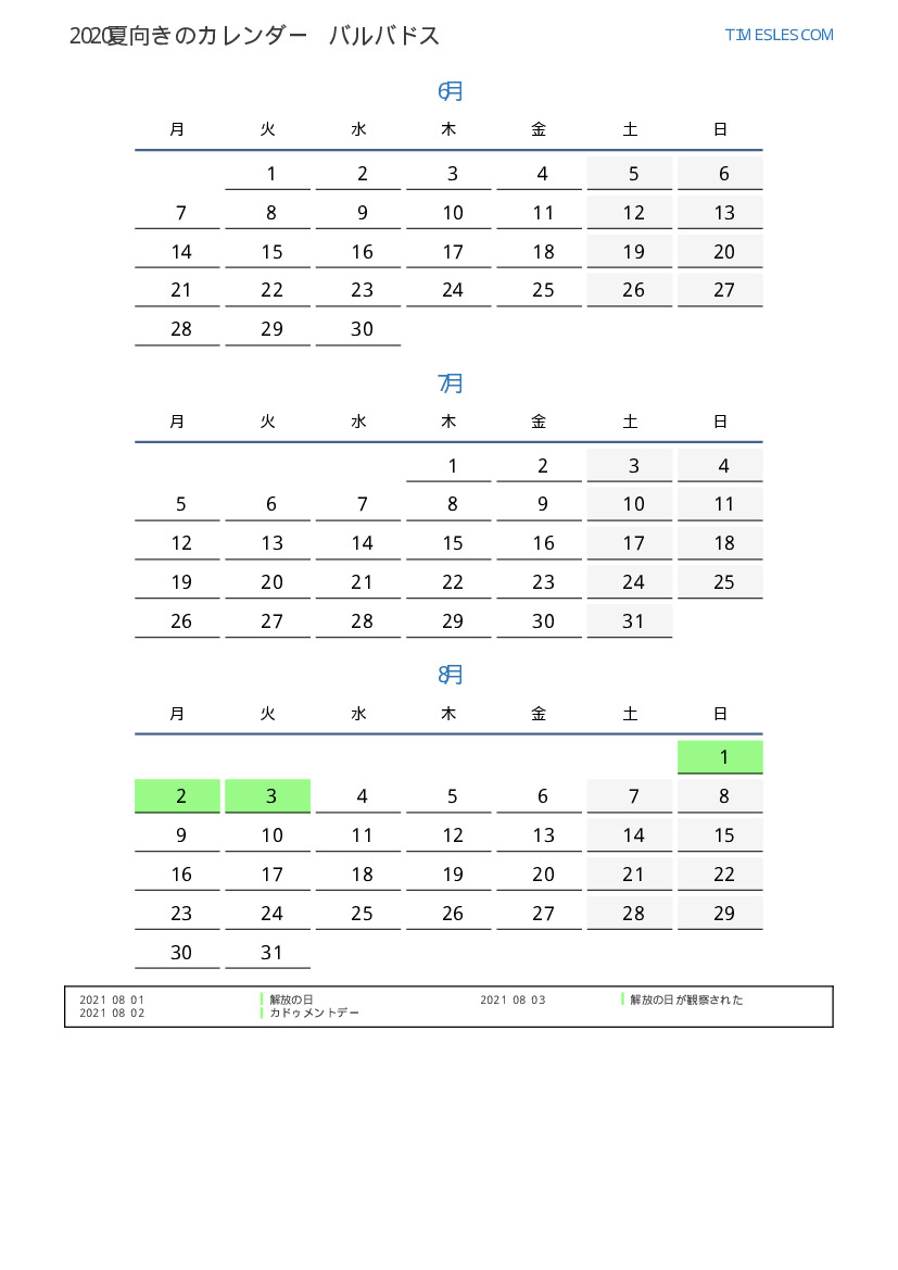 バルバドスのために2021夏向きの休日と週末のPDFカレンダーをダウンロードして印刷します