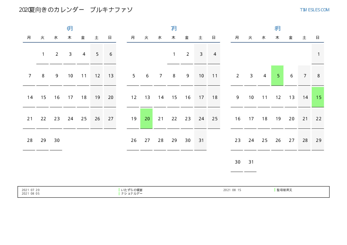 ブルキナファソ2021夏向きの休日と週末のカレンダー