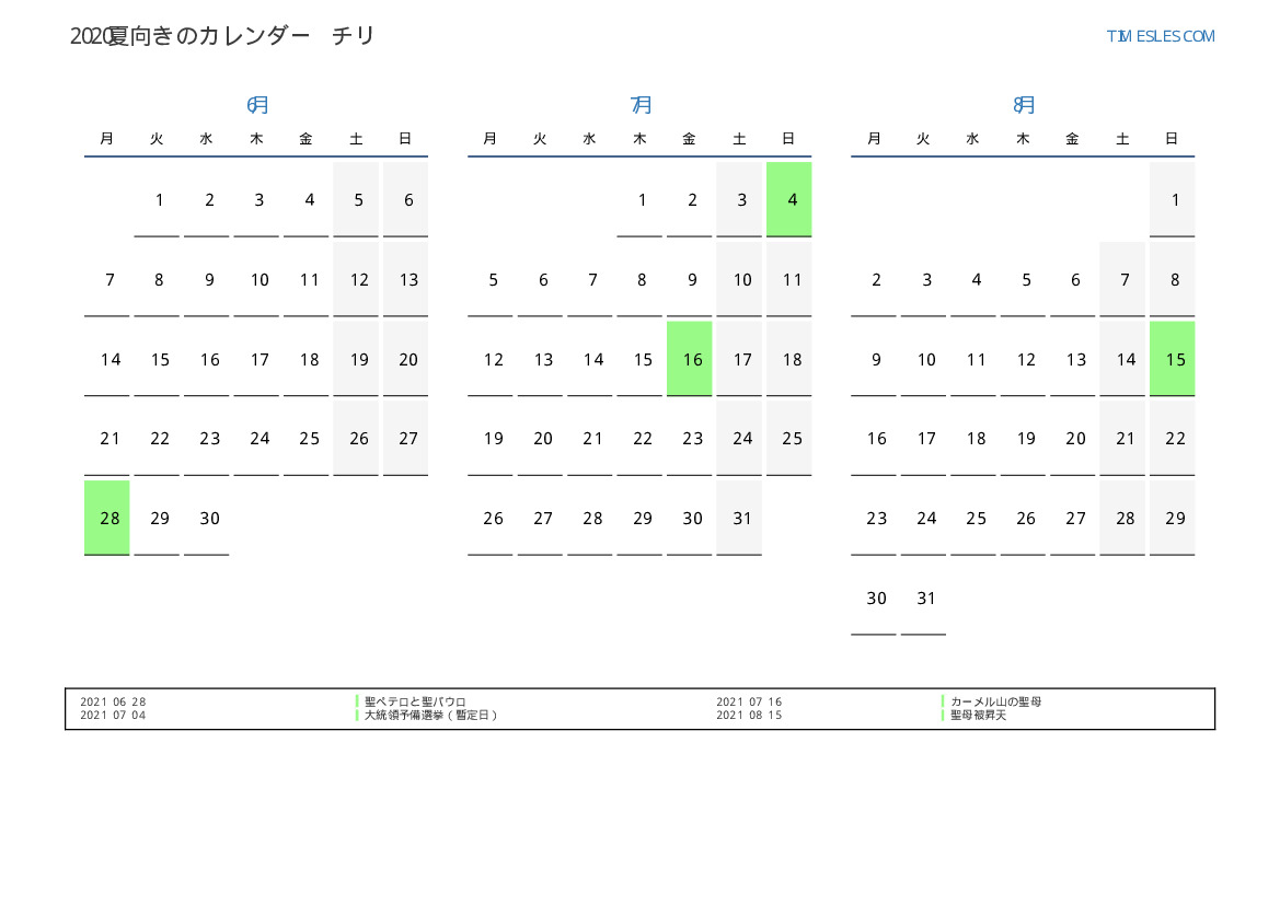 チリ向け2021夏向きの休日と週末のPDFカレンダーをダウンロードして印刷します