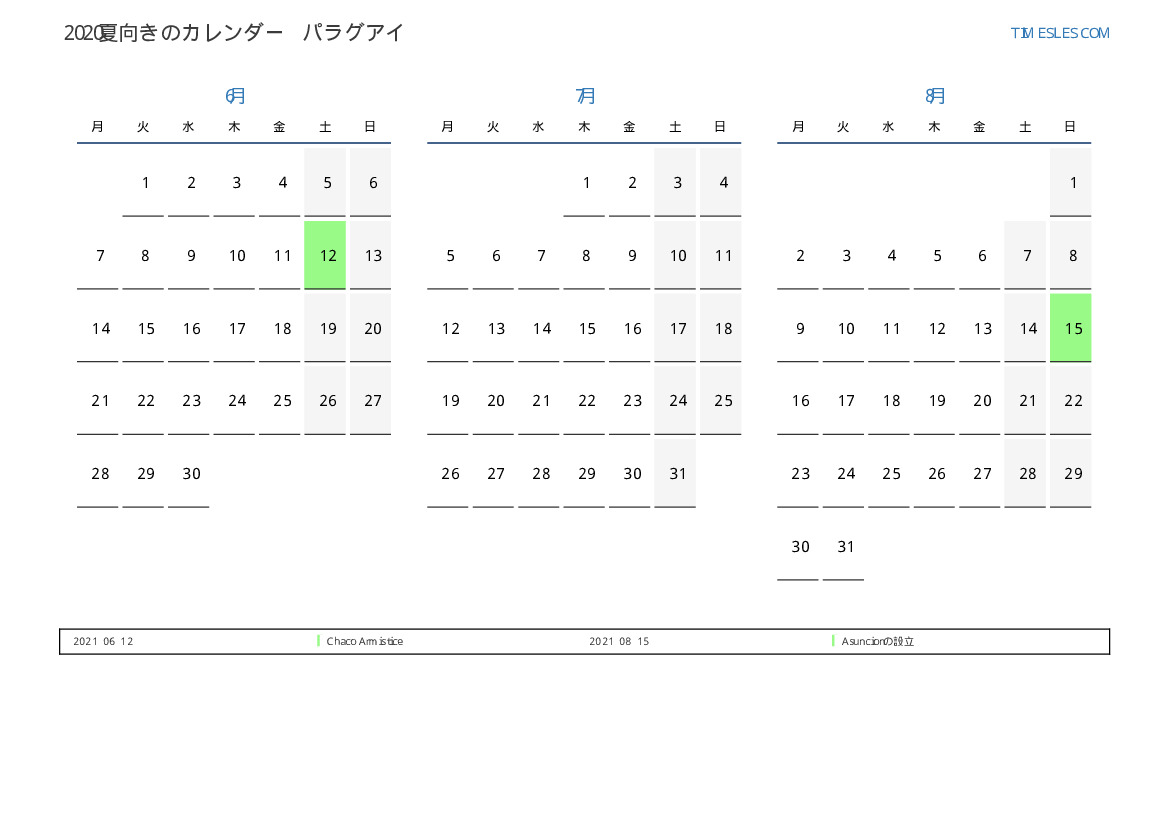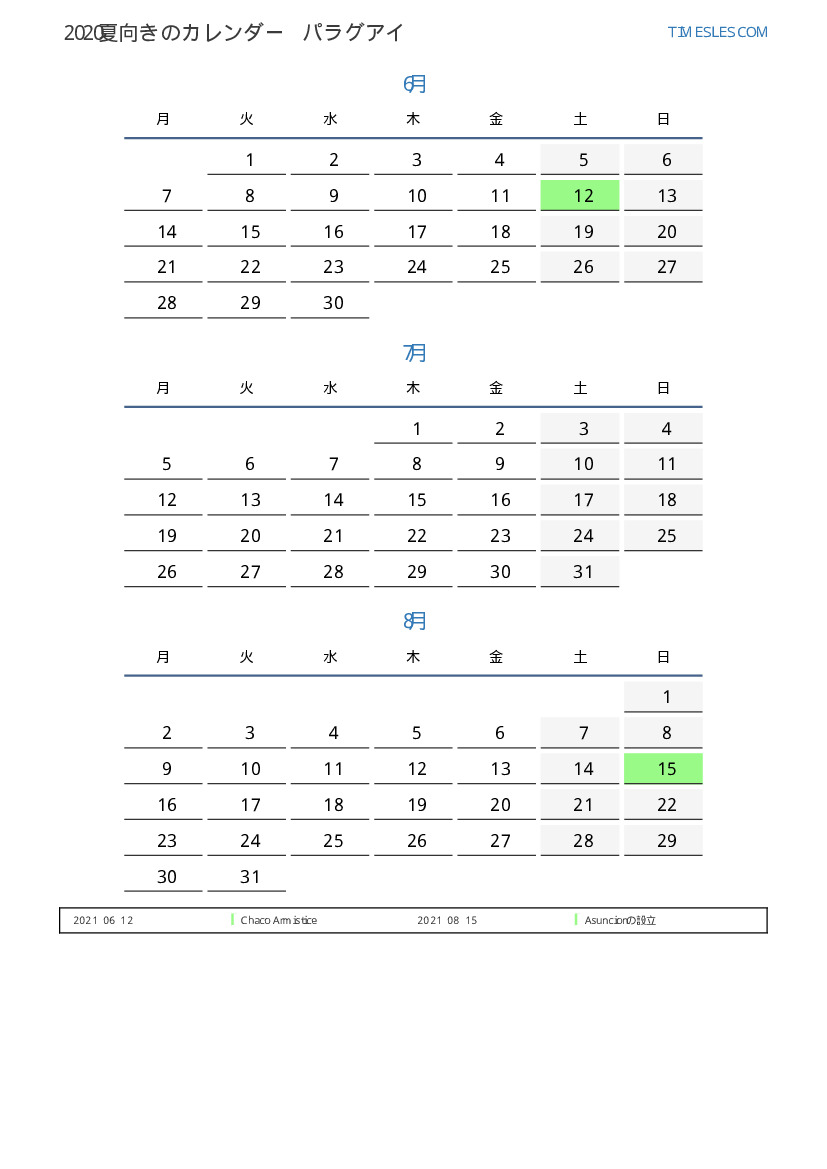 パラグアイ向け2021夏向きの休日と週末のカレンダー