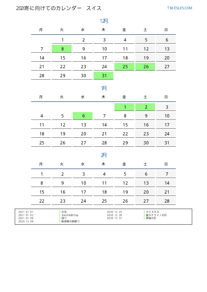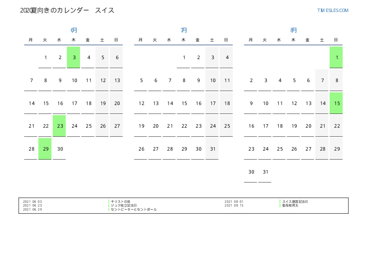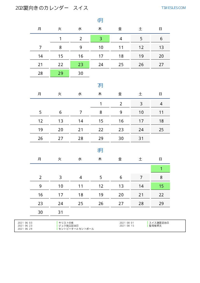 スイス向け2021夏向きの休日と週末のカレンダー