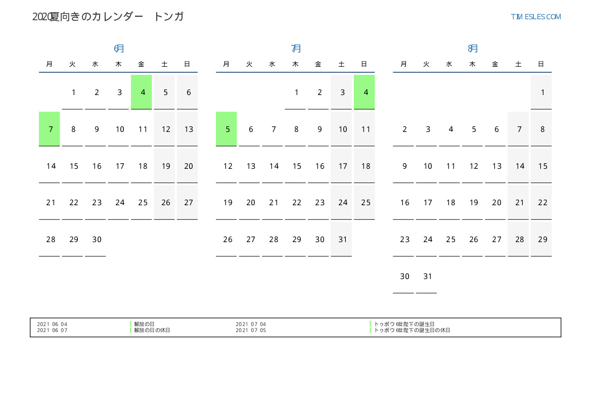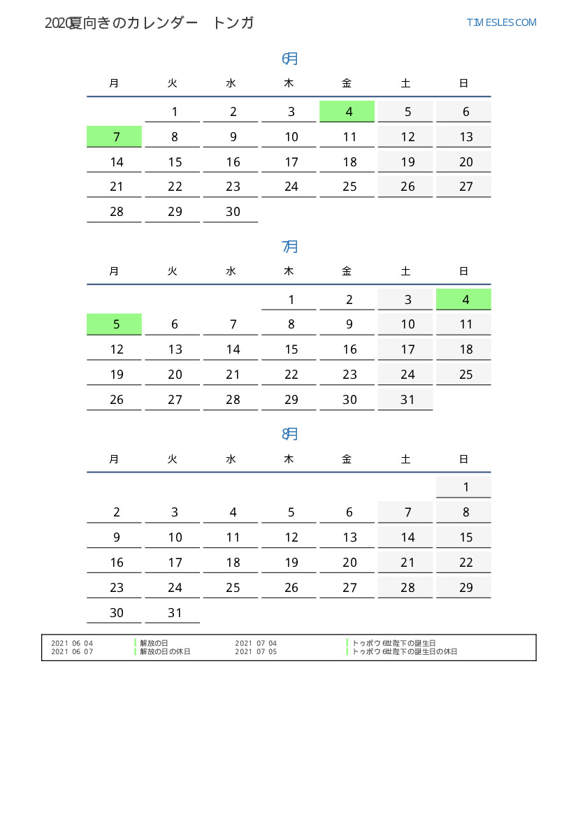 トンガのために2021年夏向きのカレンダー