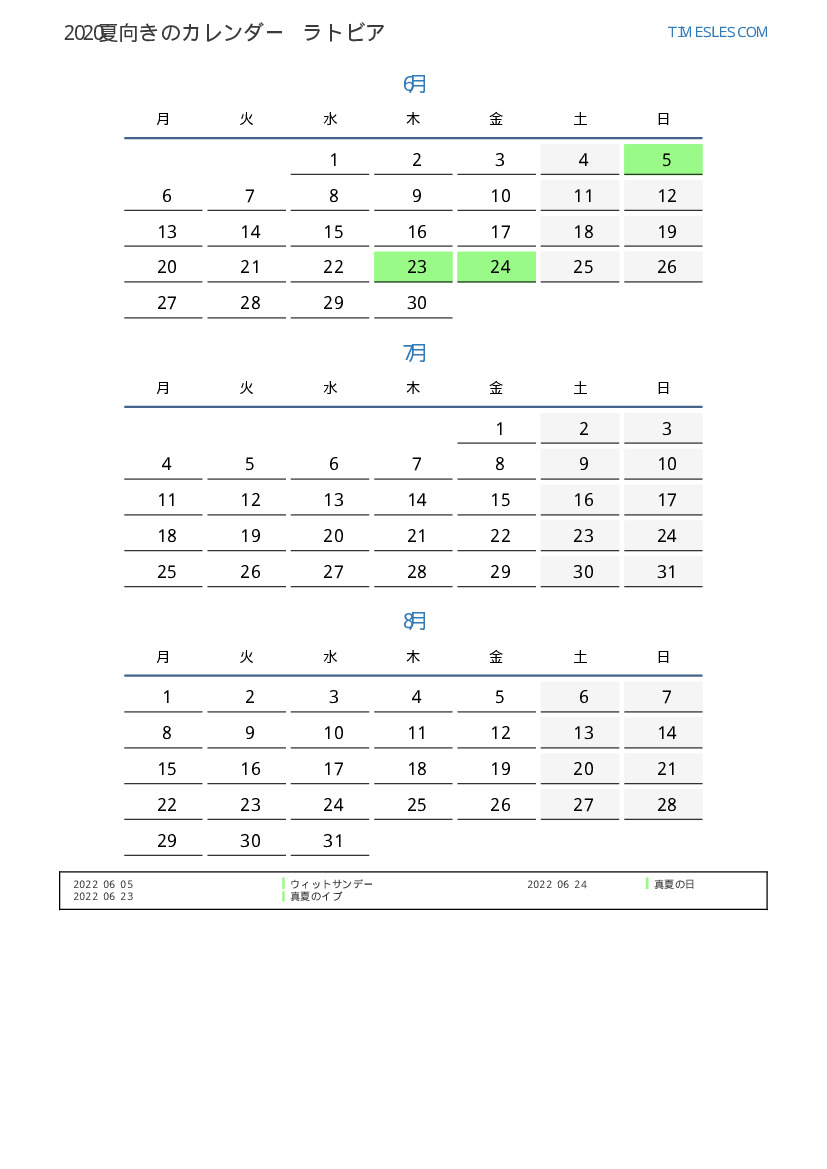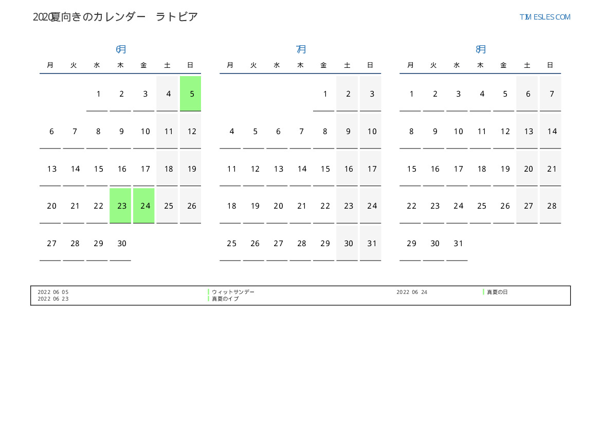 ラトビア向け2022夏向きの休日と週末のカレンダー