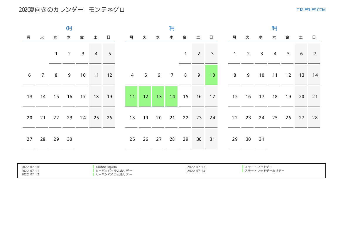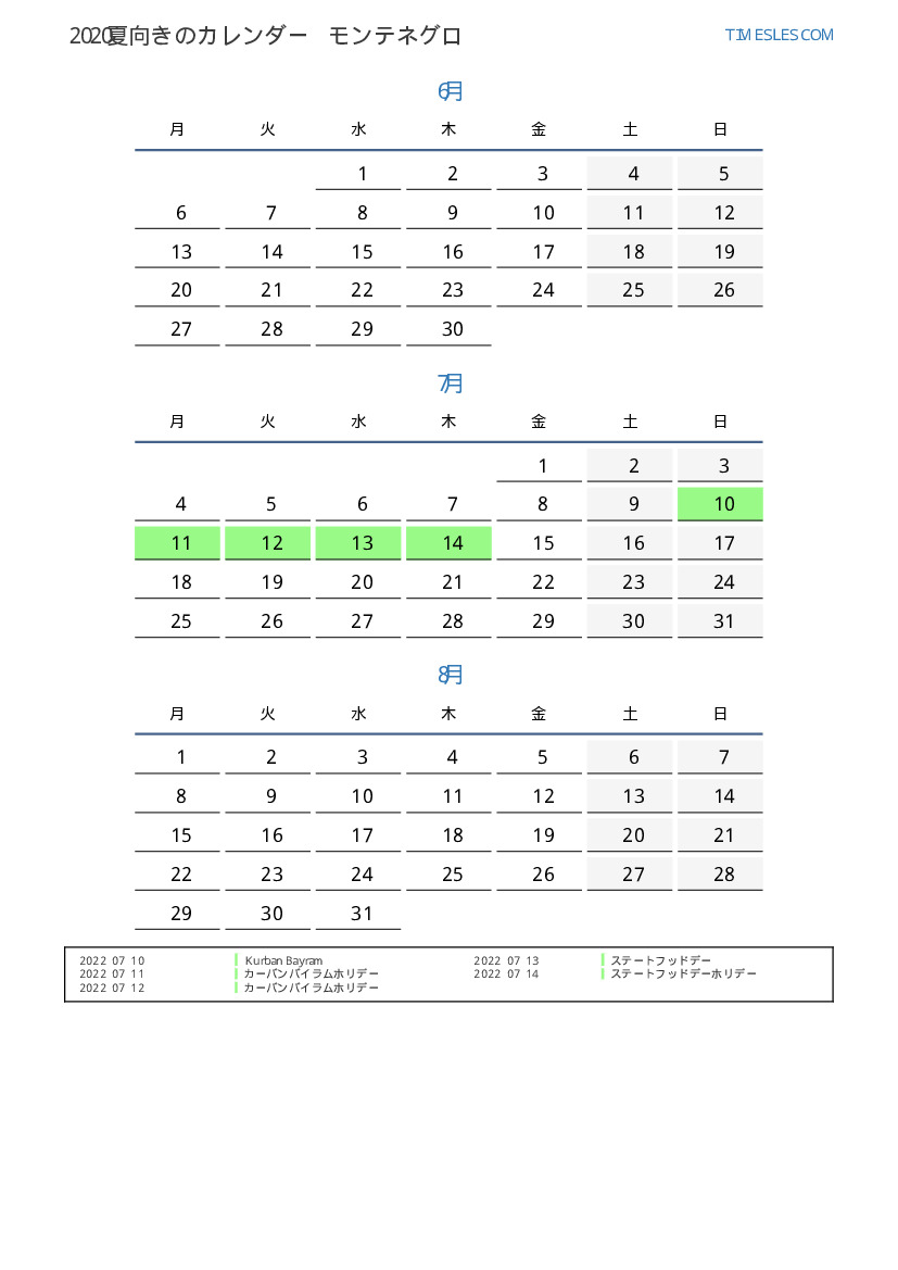 モンテネグロ向け2022夏向きの休日と週末のカレンダー