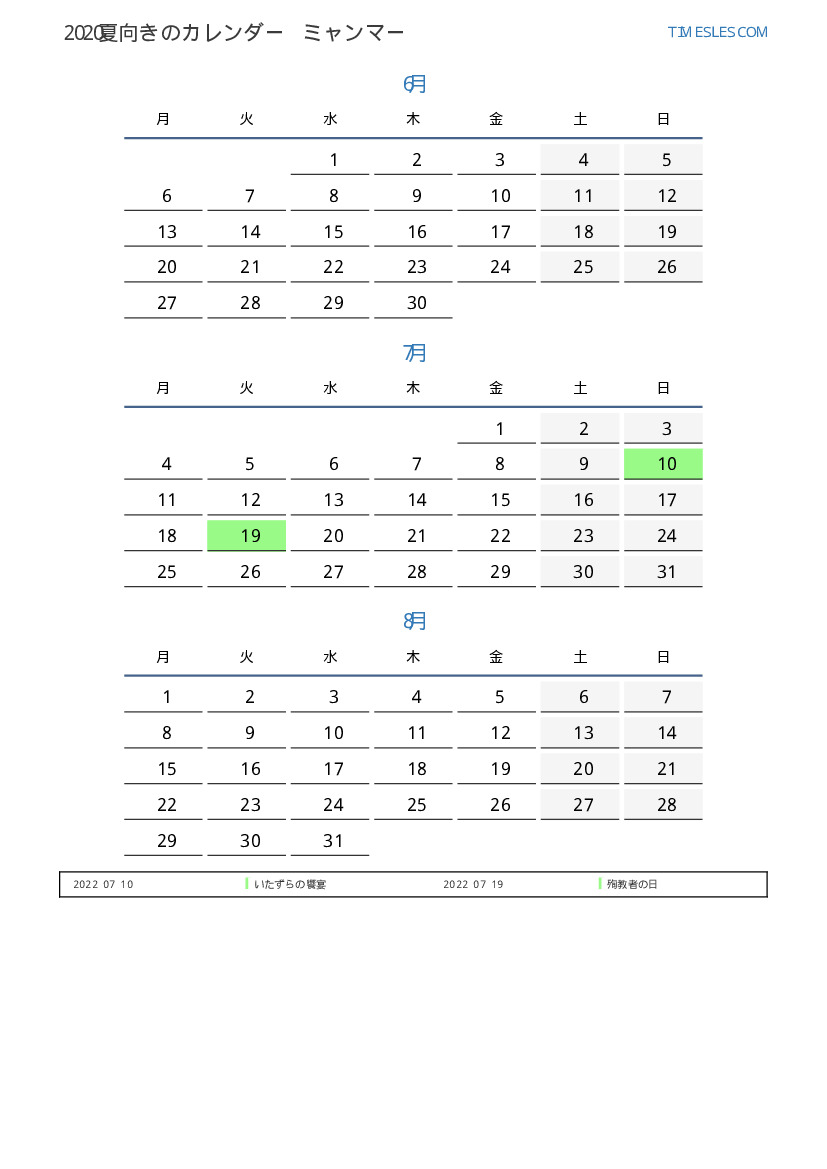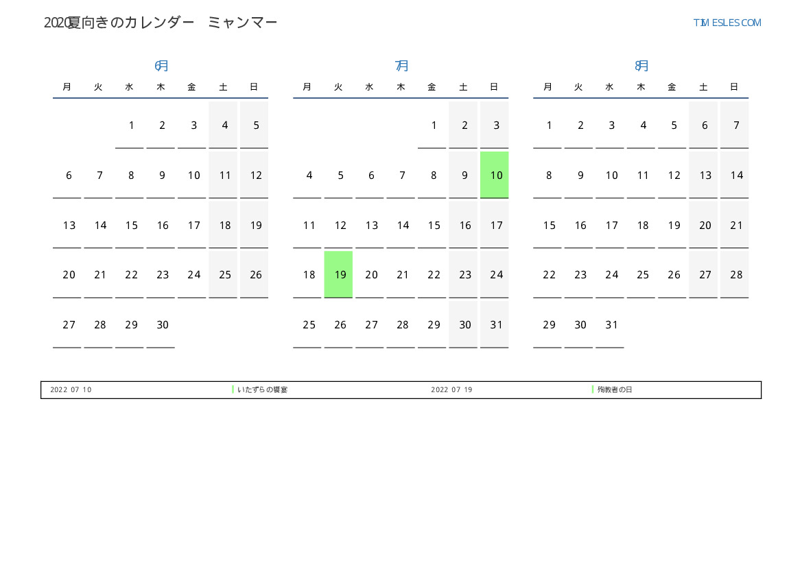 ミャンマー向け2022夏向きの休日と週末のカレンダー