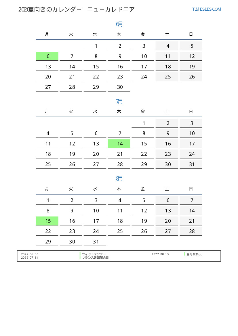ニューカレドニア向け2022夏向きの休日と週末のカレンダー