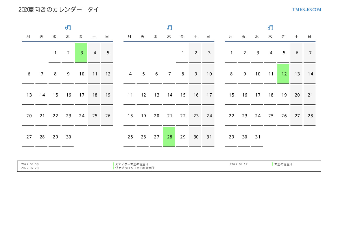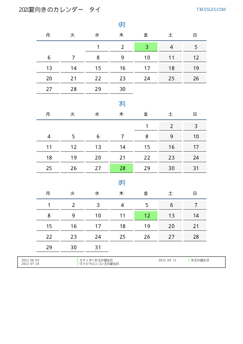 タイ向け2022夏向きの休日と週末のPDFカレンダーをダウンロードして印刷します