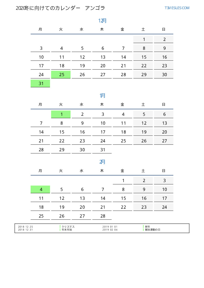 アンゴラ向け2019冬に向けての休日と週末のカレンダー