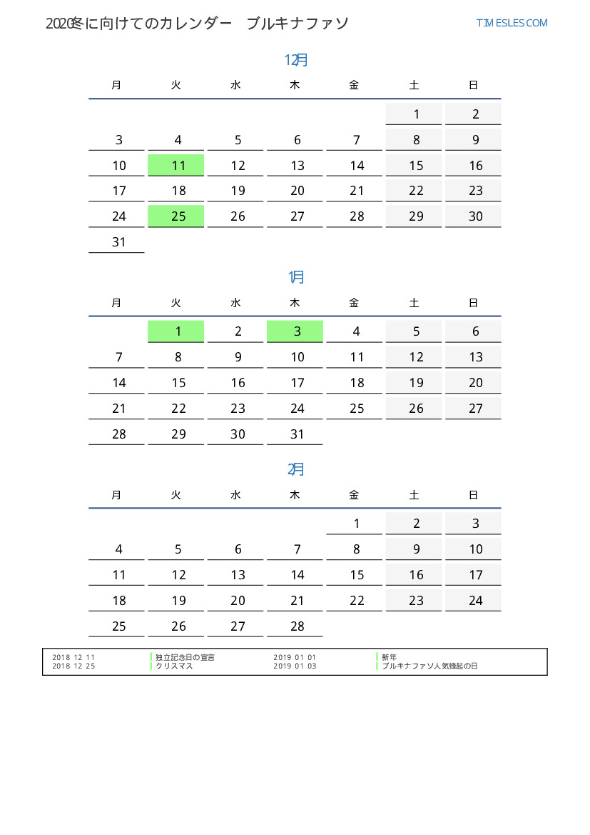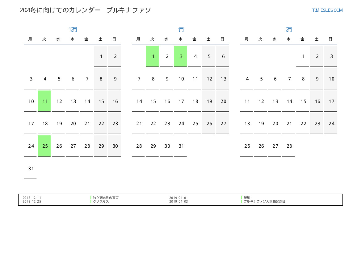 ブルキナファソ2019冬に向けての休日と週末のカレンダー