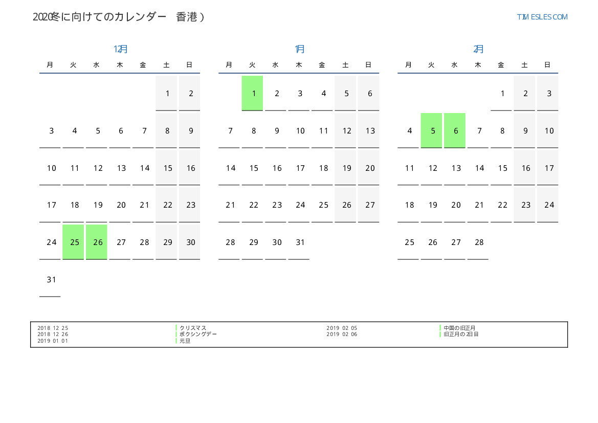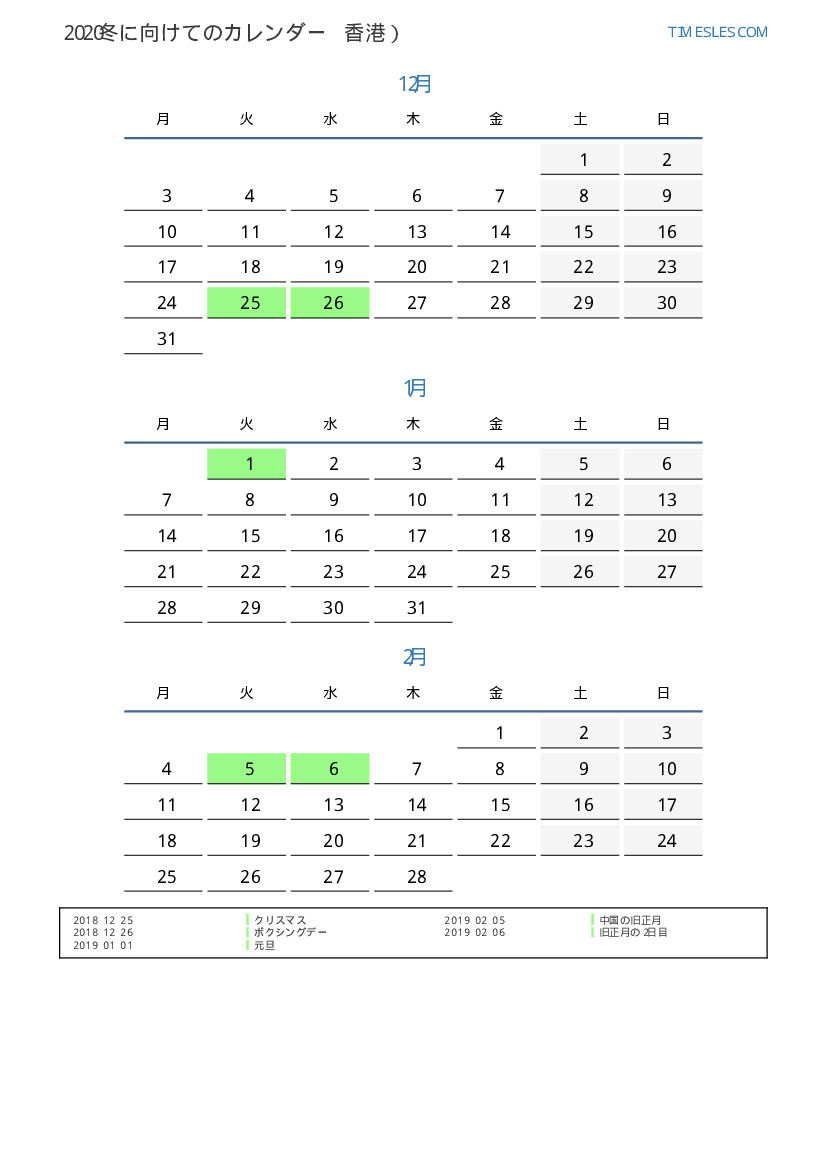 香港向け2019冬に向けての休日と週末のPDFカレンダーをダウンロードして印刷します