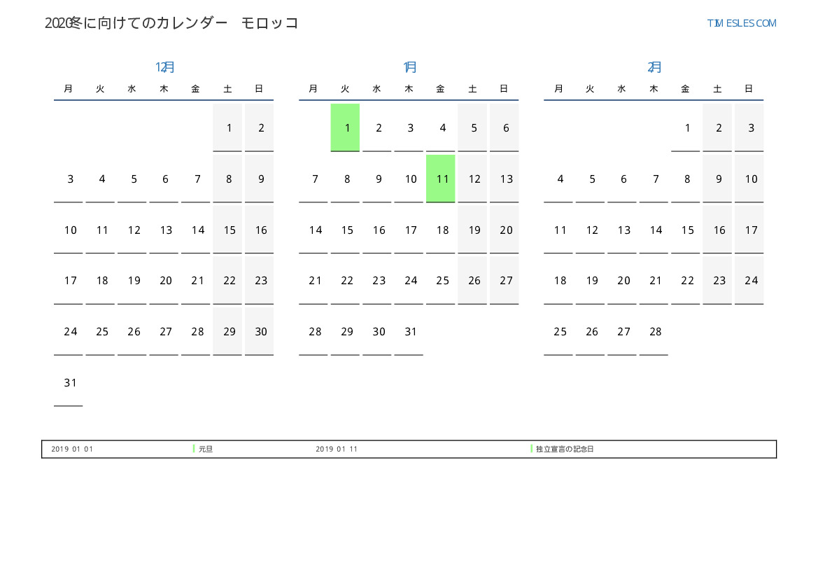 2019年冬に、モロッコ3 休日と休日があります。 2019年冬は土曜日始まり、木曜日に終わります。