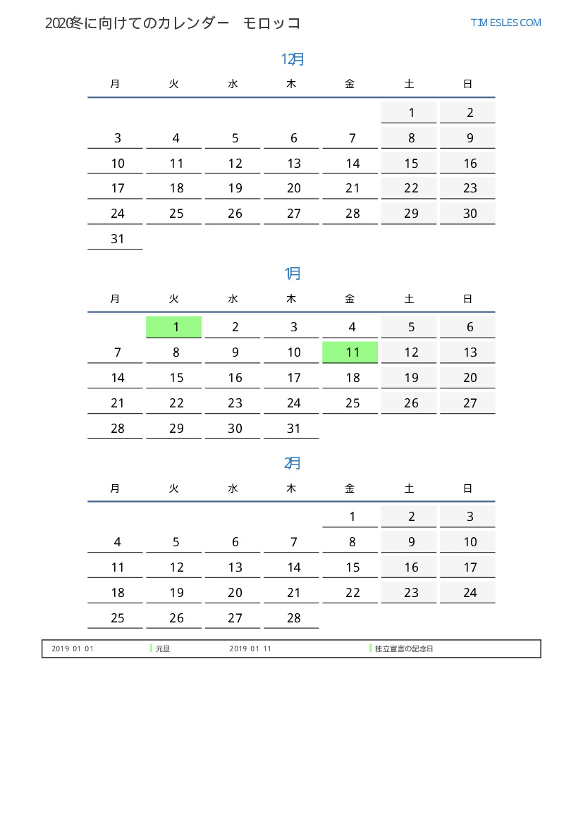 モロッコ向け2019冬に向けての休日と週末のカレンダー