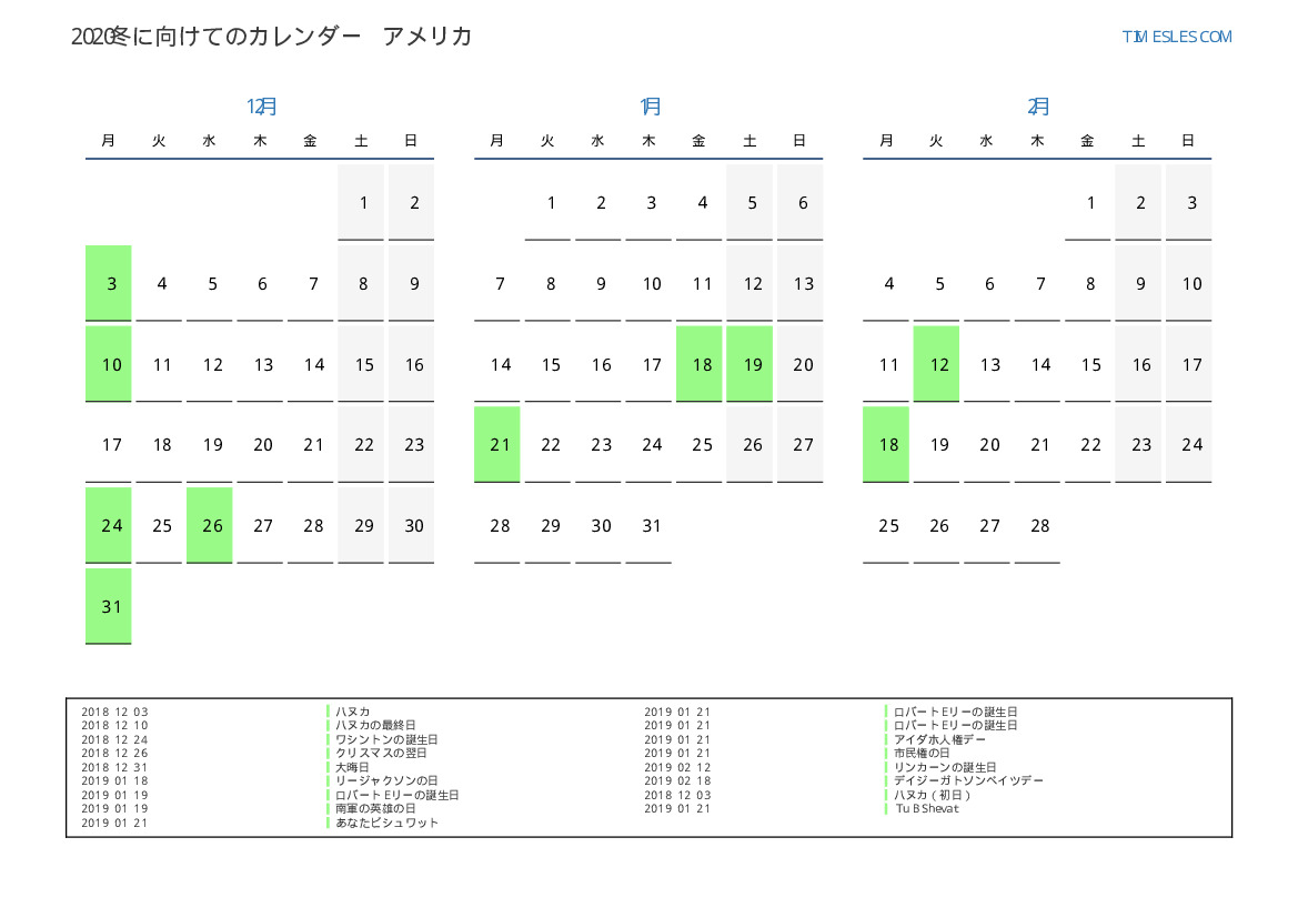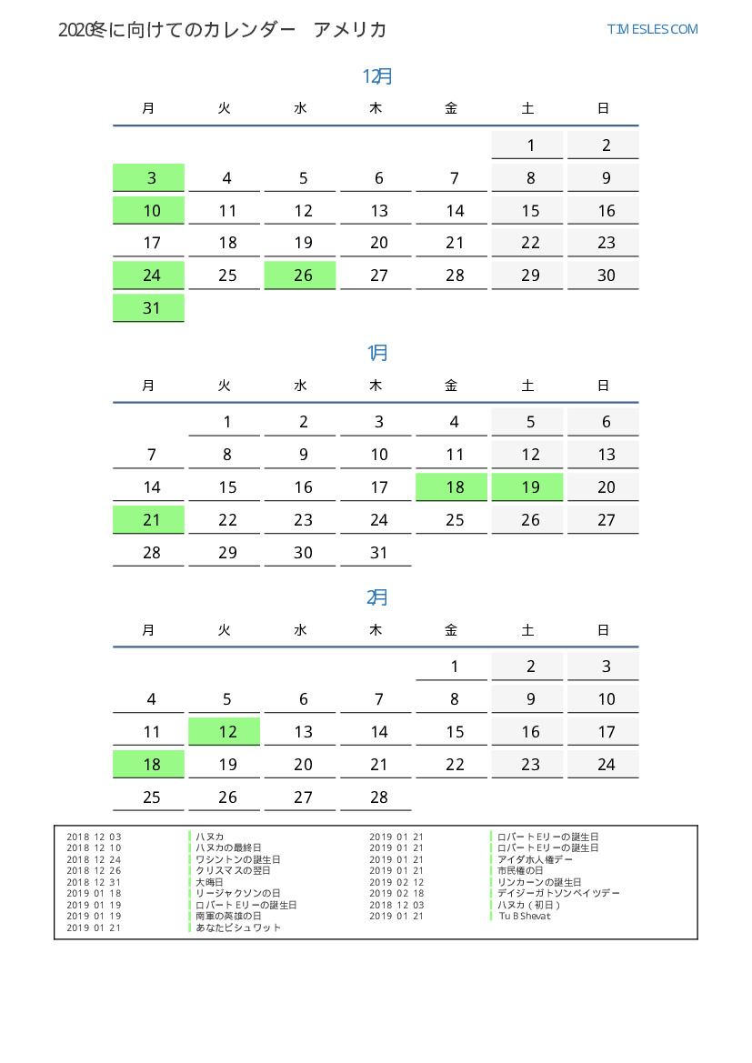 米国向け2019冬に向けての休日と週末のカレンダー