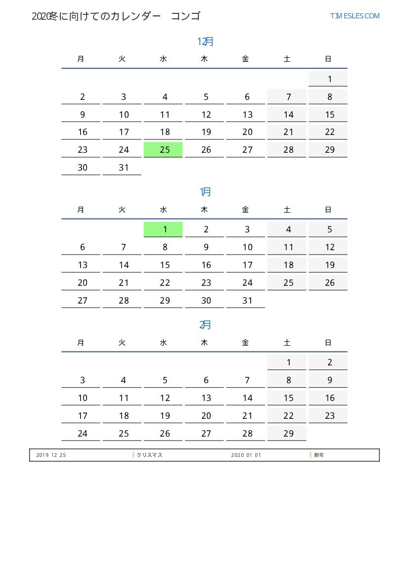 コンゴのために2020冬に向けての休日と週末のPDFカレンダーをダウンロードして印刷します