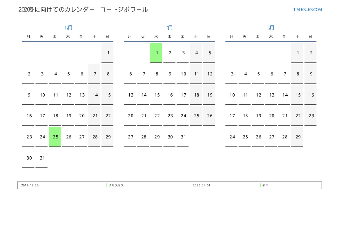 コートジボワール2020冬に向けての休日と週末のカレンダー