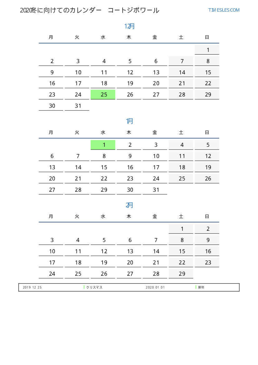 コートジボワール2020冬に向けての休日と週末のPDFカレンダーをダウンロードして印刷します