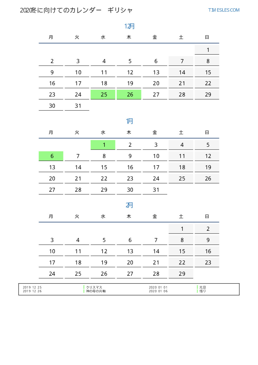 ギリシャ向け2020冬に向けての休日と週末のカレンダー