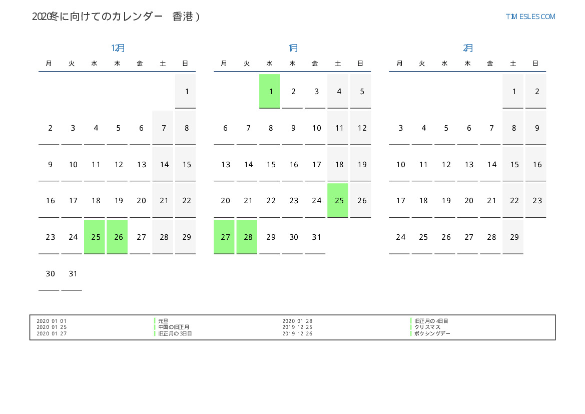 香港向け2020冬に向けての休日と週末のPDFカレンダーをダウンロードして印刷します