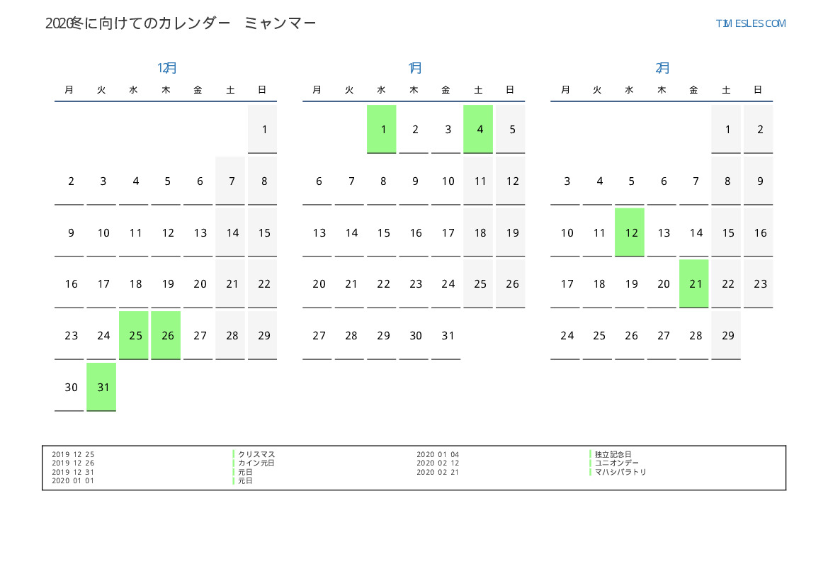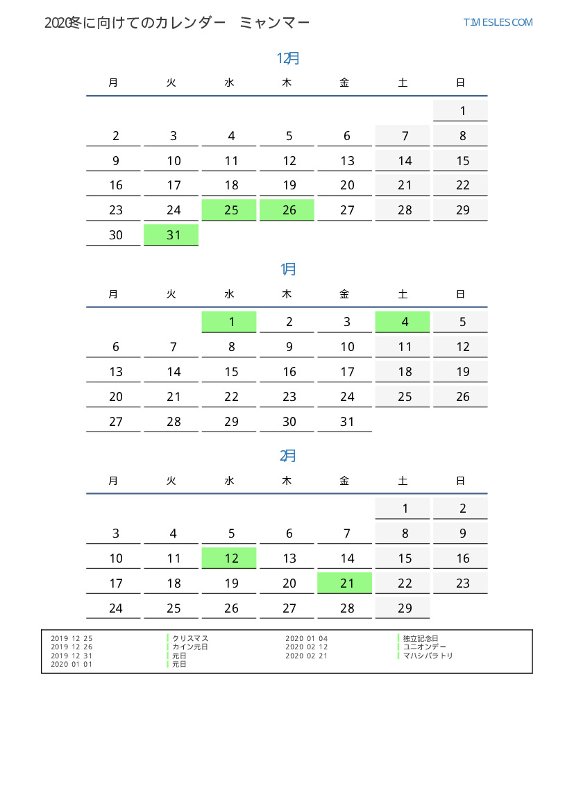 ミャンマー向け2020冬に向けての休日と週末のカレンダー