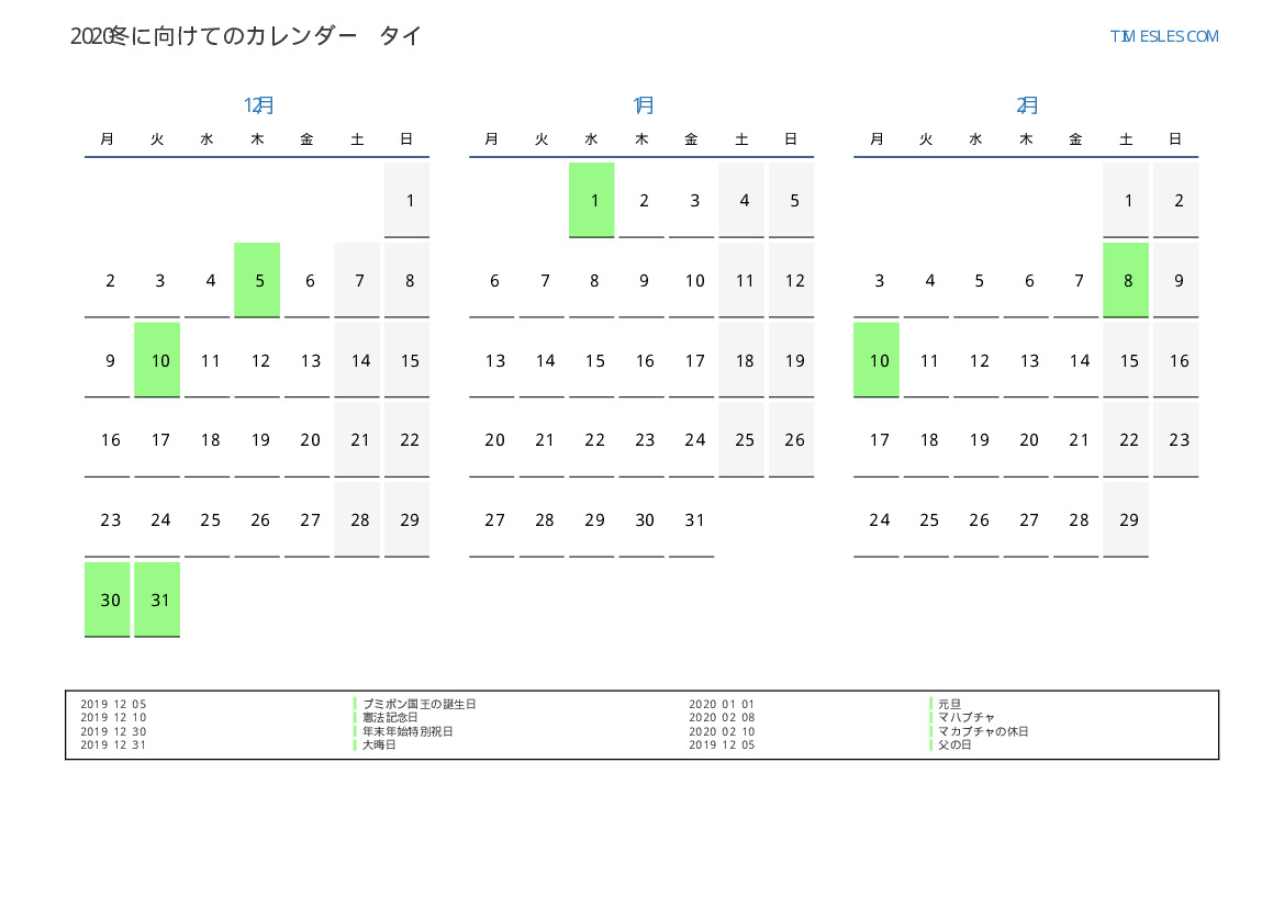 タイ向け2020冬に向けての休日と週末のカレンダー