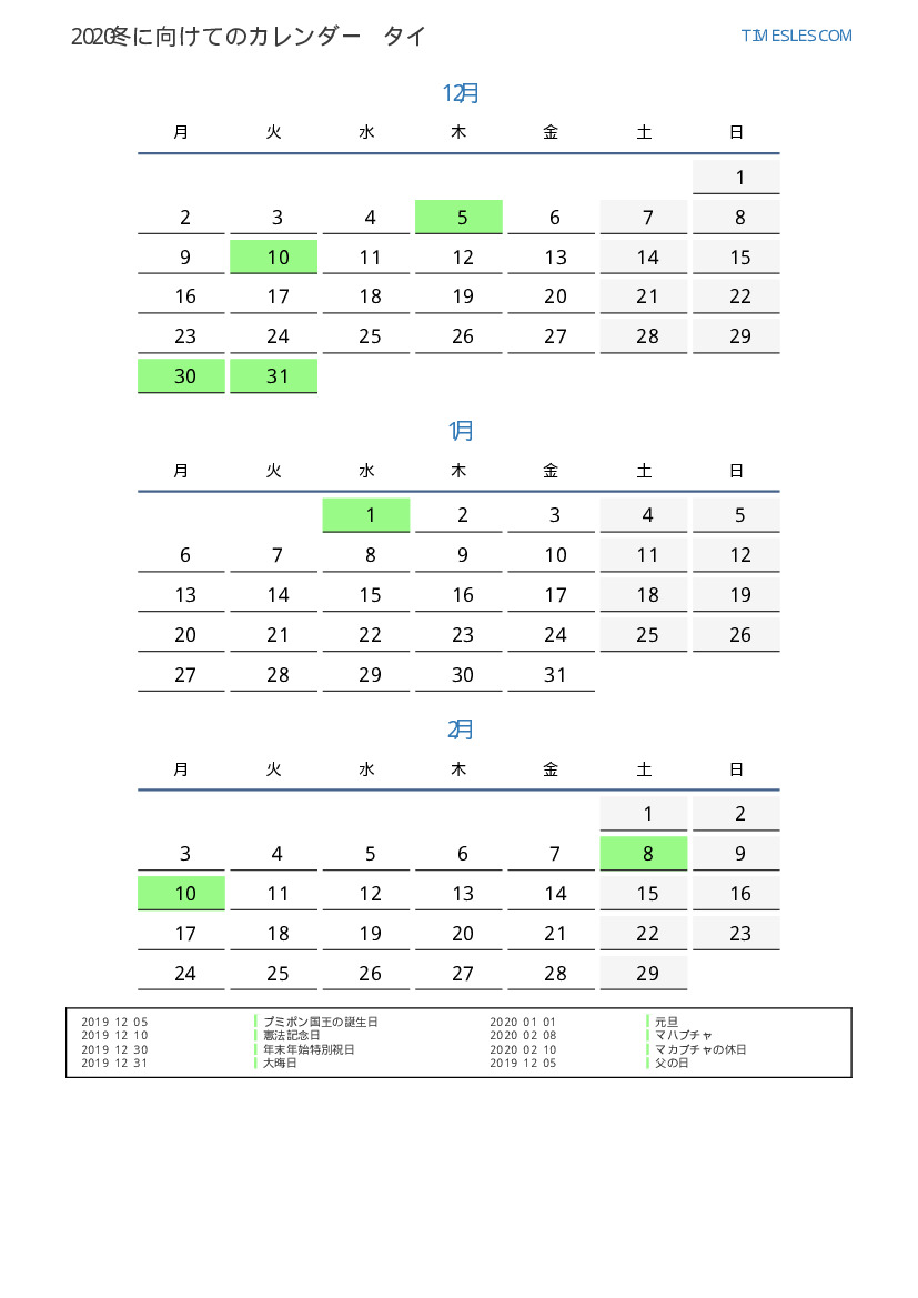 タイ向け2020冬に向けての休日と週末のPDFカレンダーをダウンロードして印刷します