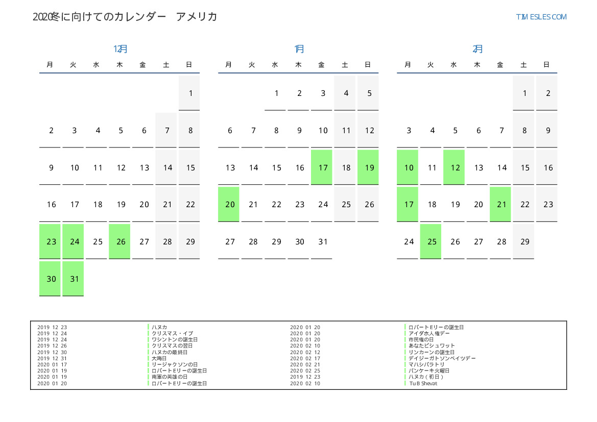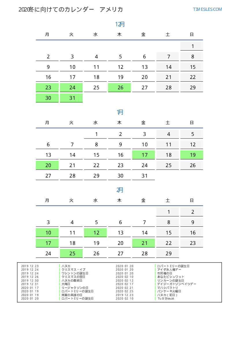 米国向け2020冬に向けての休日と週末のカレンダー